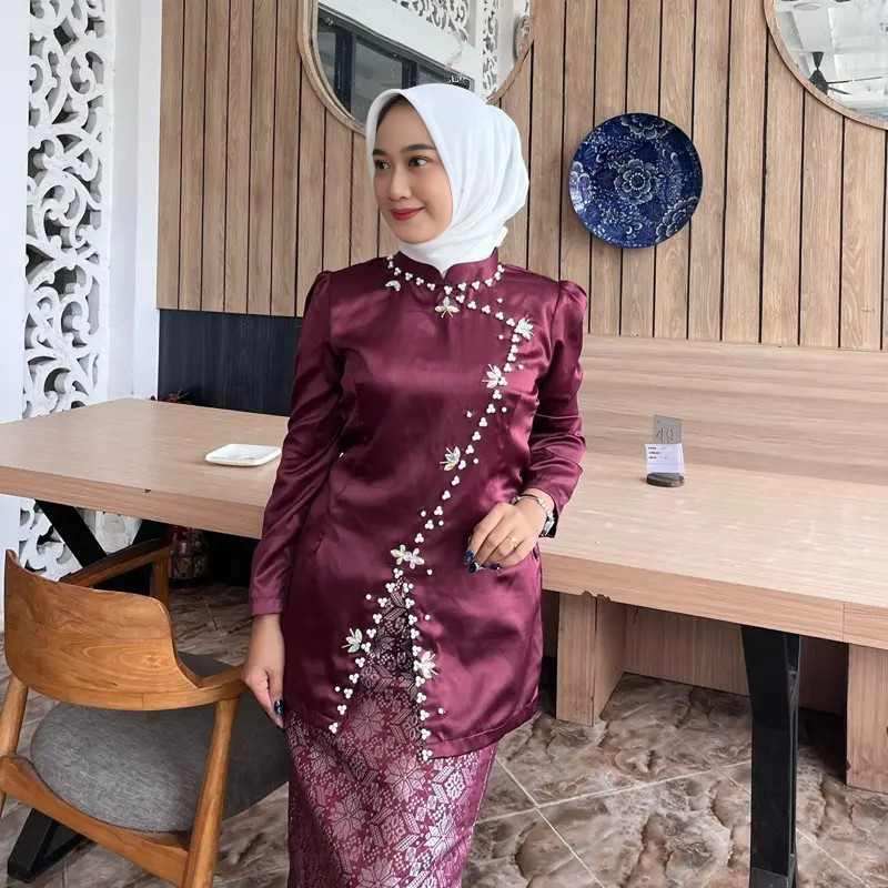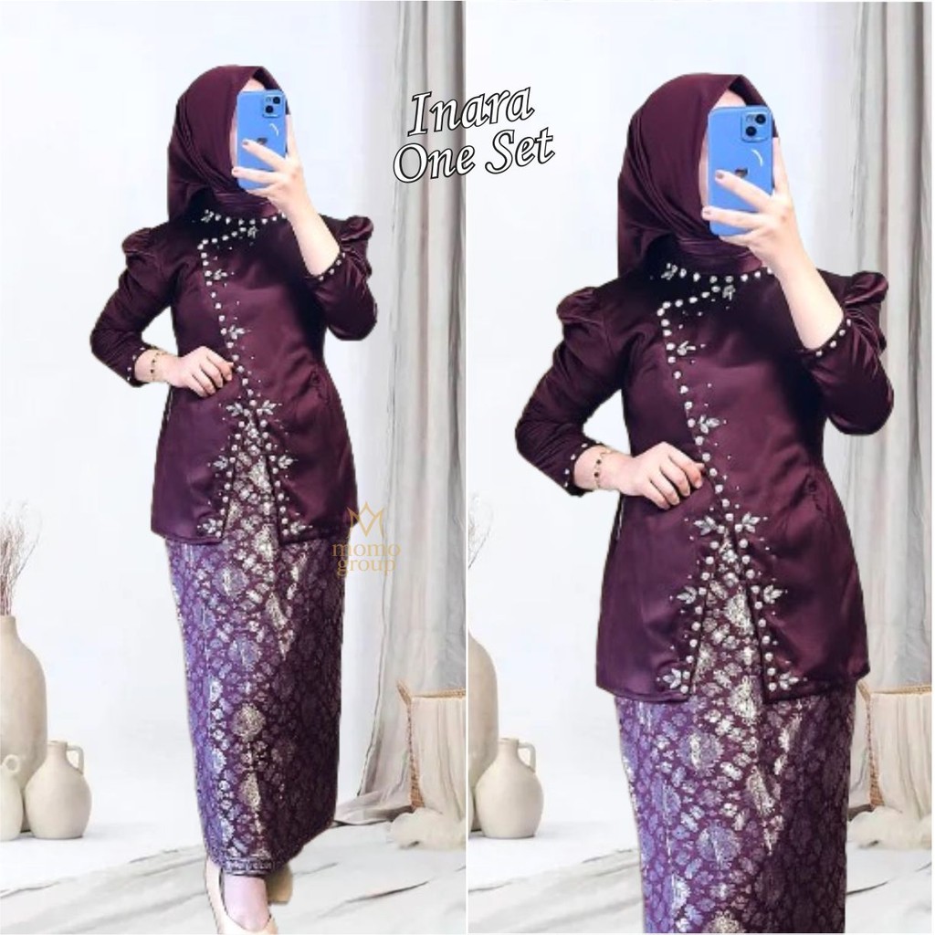INARA One Set Rok Songket Baju Kurung Malayu Mahogany Burgundy Knit Kancing Full Payet Kebaya Setelan Kondangan Bridesmaid Wisuda Lebaran