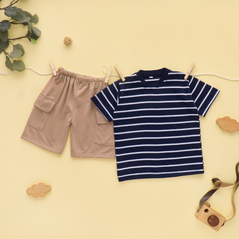 Setelan Anak Kaos Salur Stripe Dan Celana Cargo Usia 1-5 Tahun