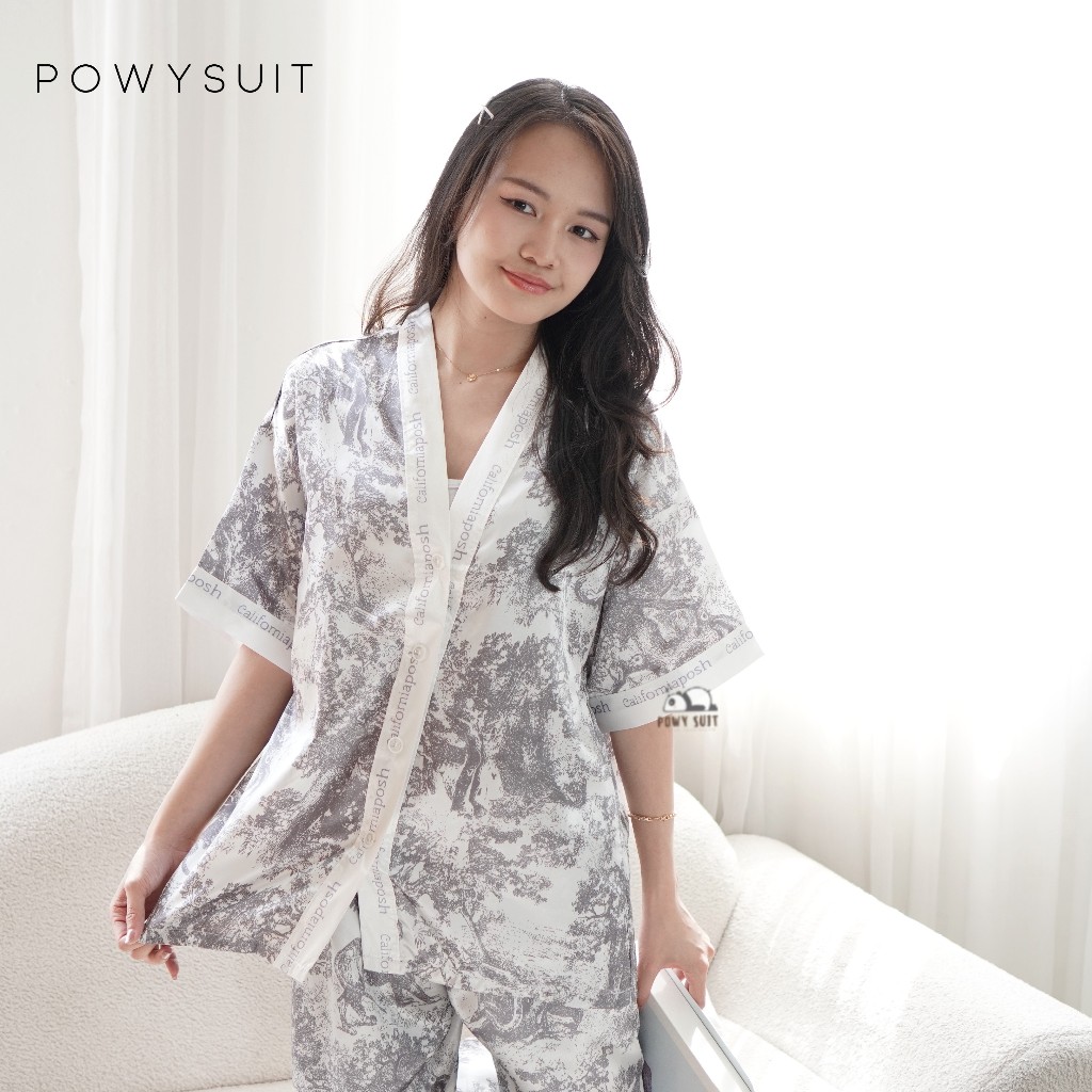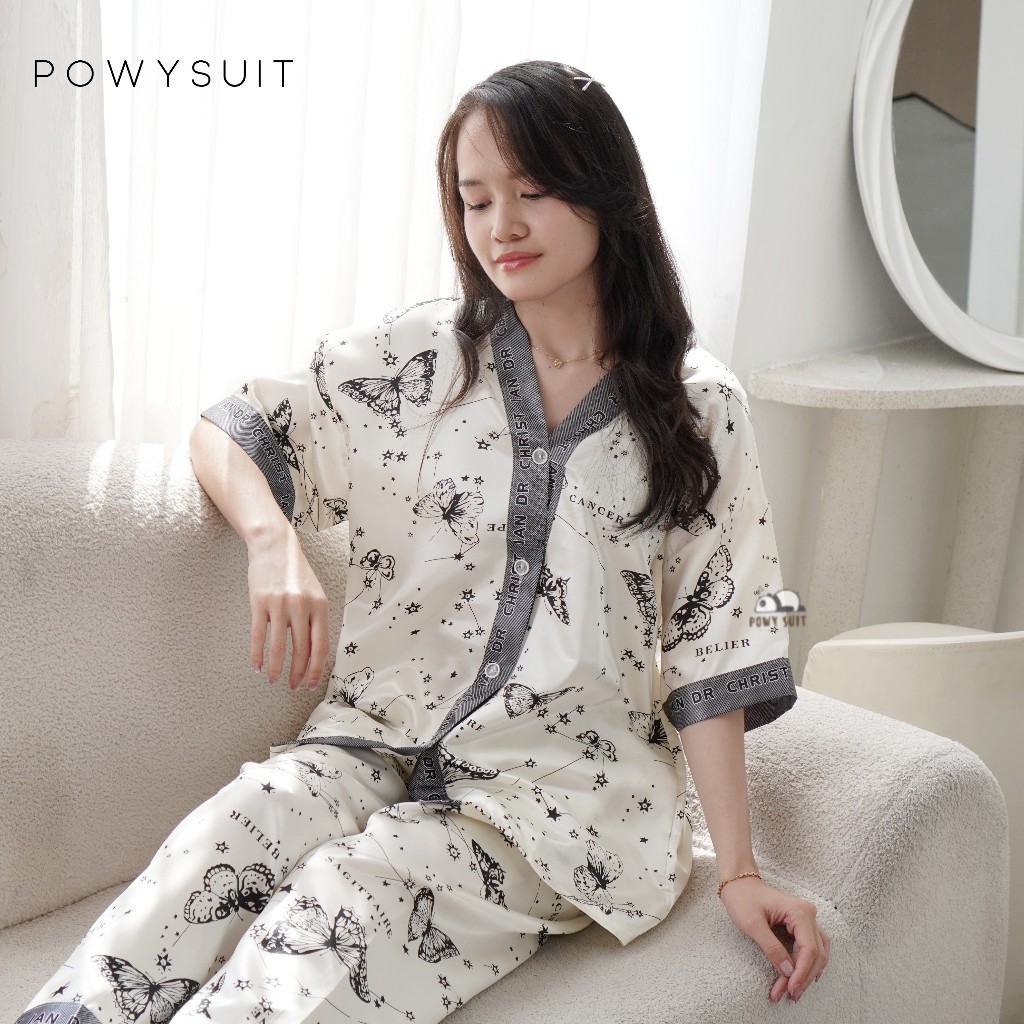 ST Powysuit Piyama V neck Motif Powysuit Satin Lengan Pendek Celana Panjang Baju Tidur Wanita