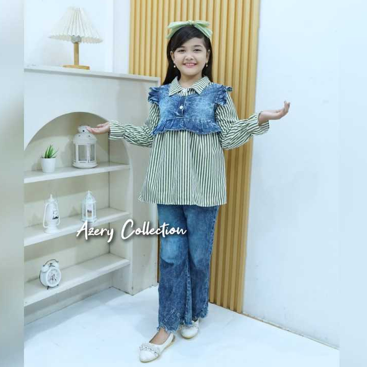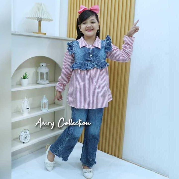 Baju Setelan Anak Perempuan 3-9 Tahun, Baju Kemeja Salur dan Celana Jeans Cutbray - Fashion