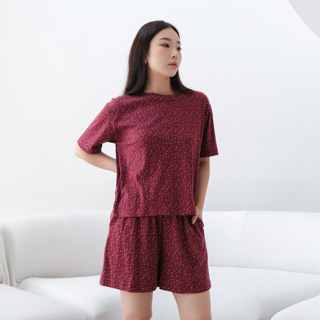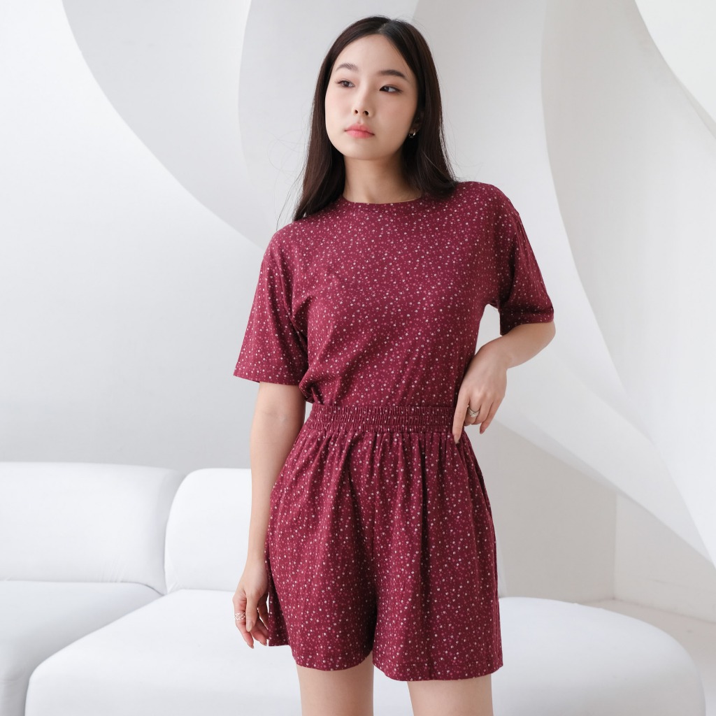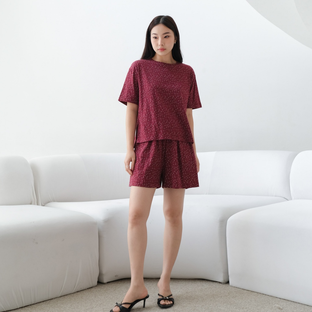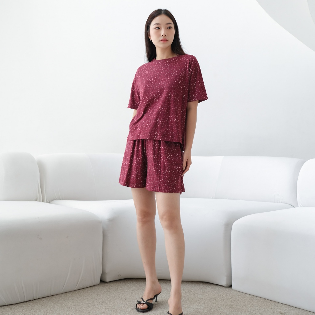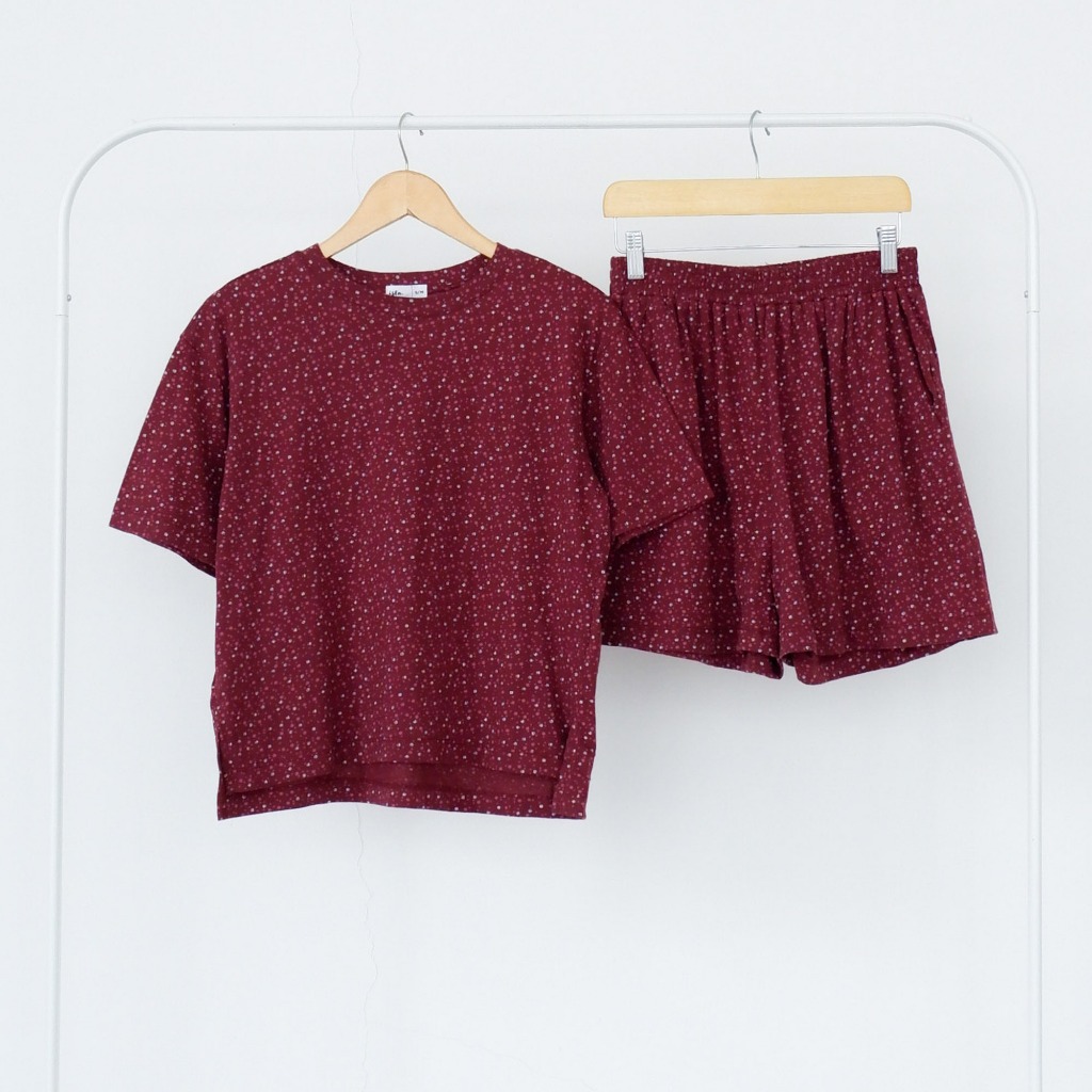 Isla Hyejin Maroon Print Top - Set - Set Wanita - Baju Setelan - Setalan Baju Tidur - Pakaian Tidur - Baju Imlek
