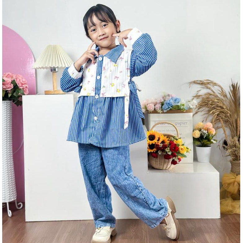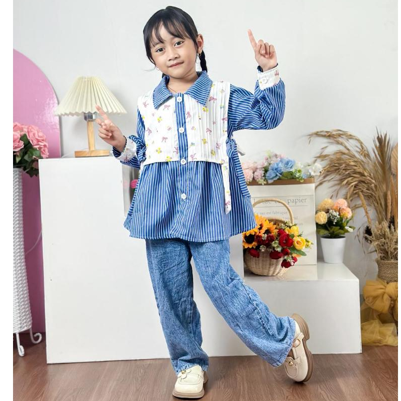 Baju Stelan Anak Perempuan Usia 3-11 Tahun, Baju Salur Dan Celana Cutbray