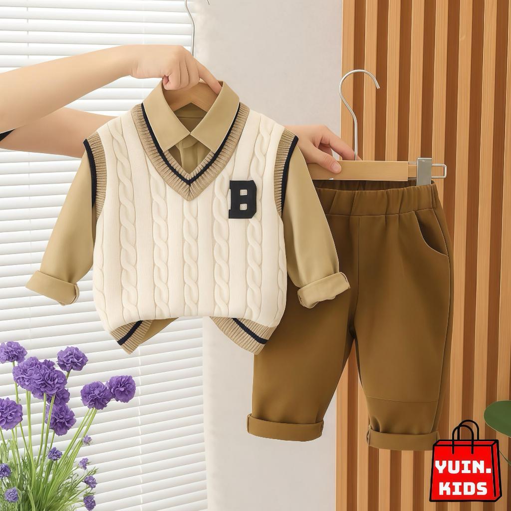 Setelan 3in1 Anak Laki-laki 1-5 Tahun Motif B 3D Kemeja Rompi Rajut Dan Celana Chinos Panjang Anak