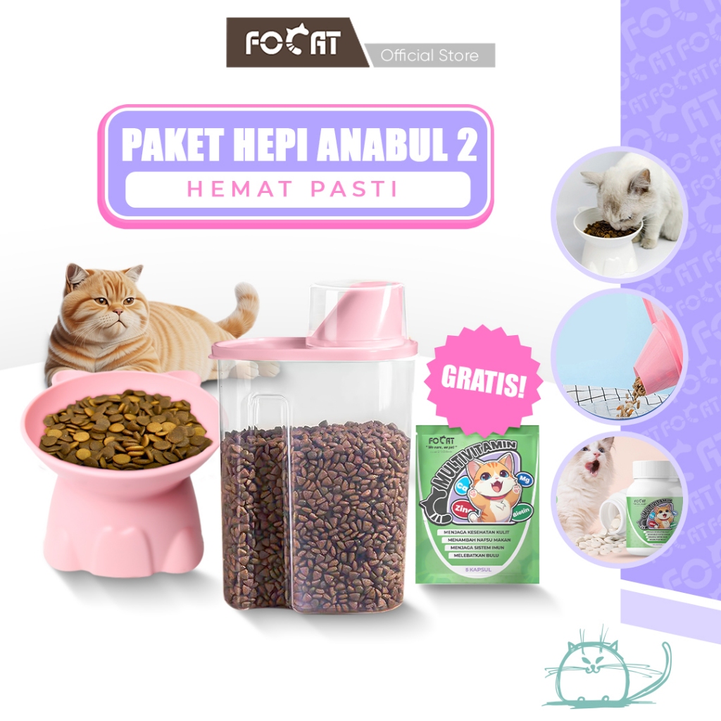 PAKET HEPI 2 FOCAT Mangkok Kucing Anjing M92 Tempat Penyimpanan Makanan Hewan C82 GRATIS Multivitamin Kucing