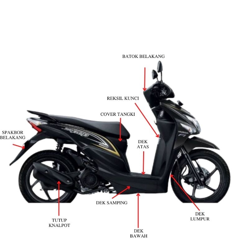 Batok Belakang, Dek Bawah, Spakbor Belakang, Tutup Knalpot, Dek Atas, Cover Tangki, Reksil Kunci, Dek Lumpur, Dek Samping