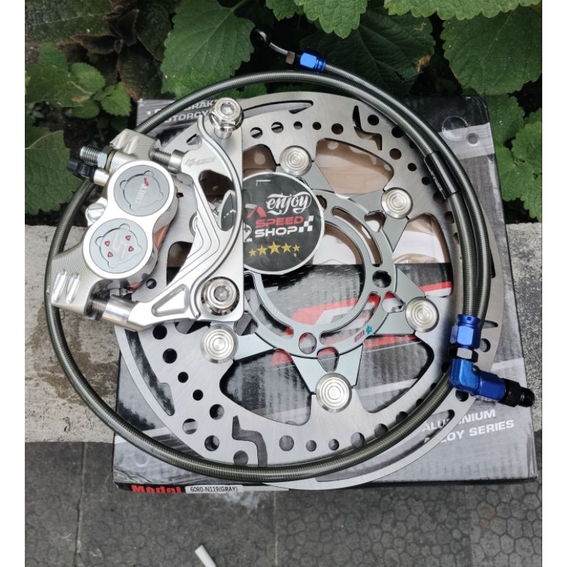Paket Rem Depan Kaliper 4P Formula Mini . Plus Breket Cnc 220 Mm Motor Mio Smile / Soul Karbu / Xeon & Mio Sporty