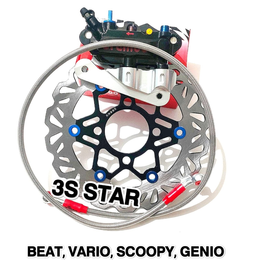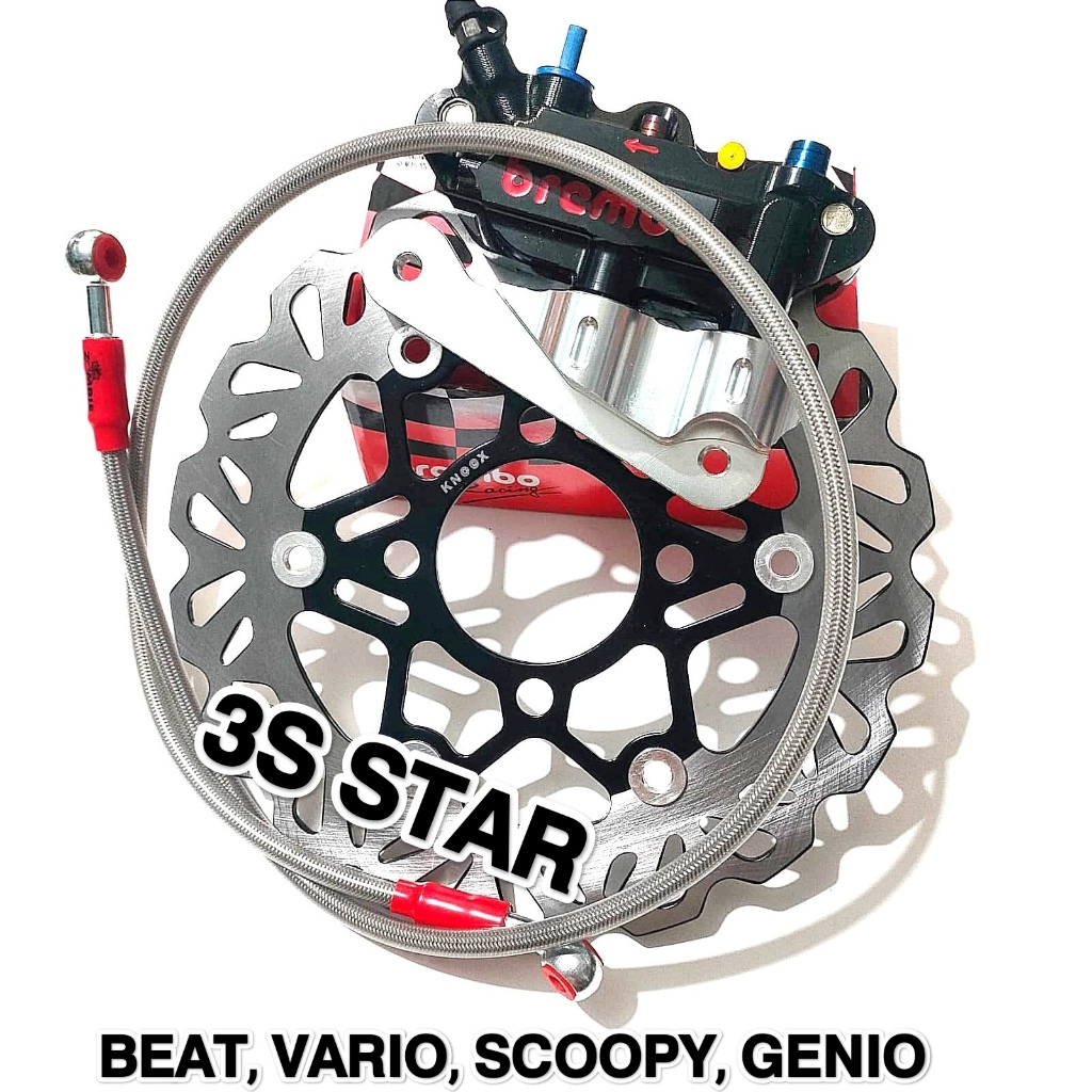Paket Kaliper Kiri Depan 4 Piston + Baut Kerucut 2Pcs + Piringan 220Mm + Selang Rem 95Cm + Breket Kiri Beat, Vario, Scoo