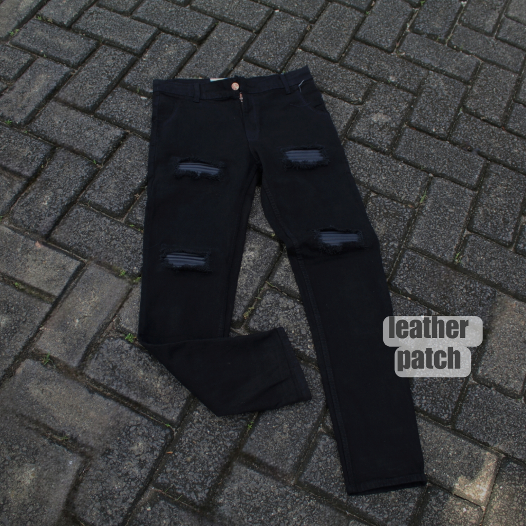 Celana Sobek Tambal LEATHER PATCH / Celana Panjang Jeans Pria Pakai Lapisan