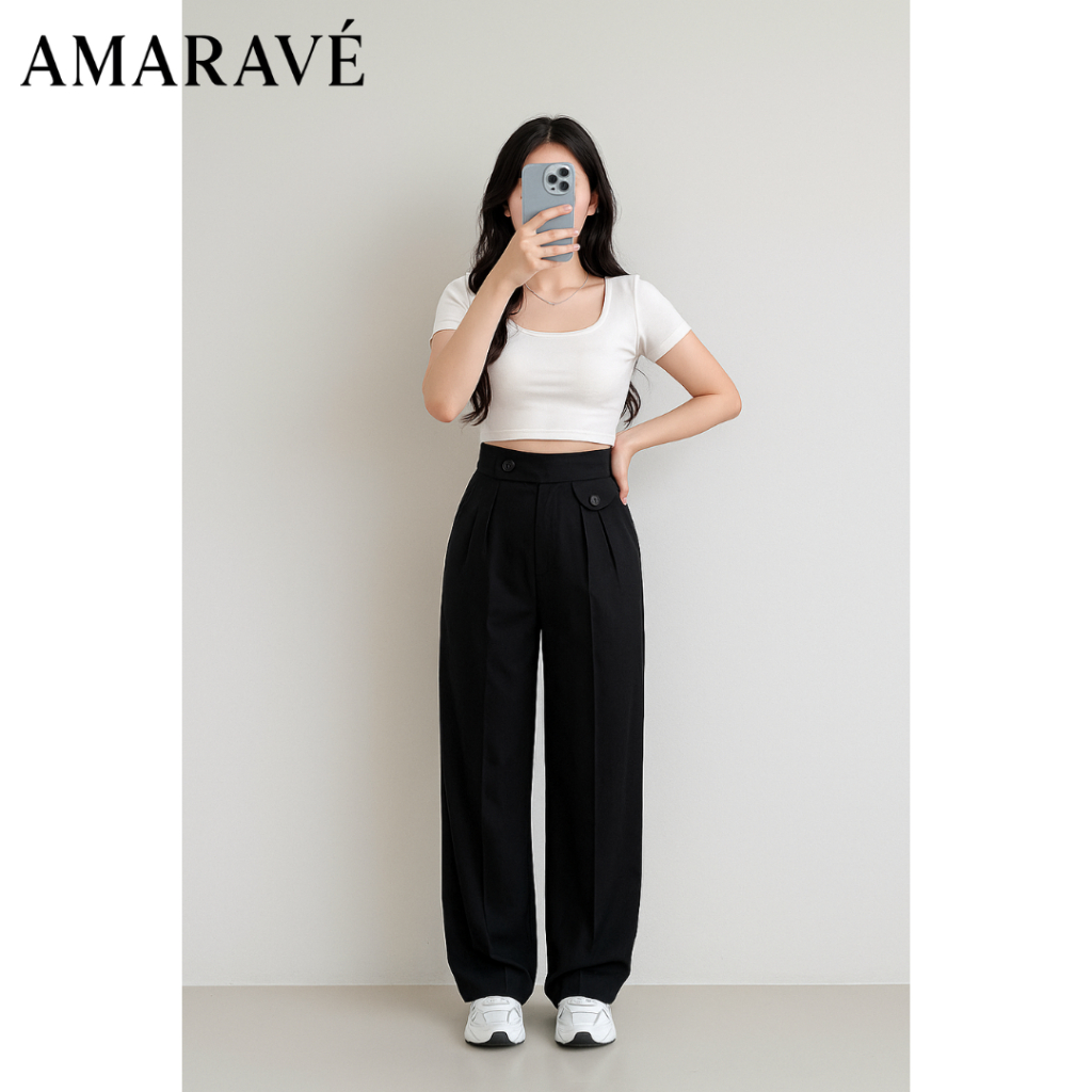 AMARAVE - Celana Bahan Wanita Kerja Loose Pants Trouser Petite Highwaist Anti Kusut Kekinian - Celana Kulot Wanita