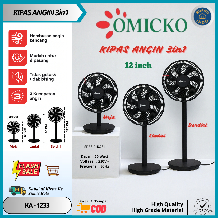 Kipas Angin 12in Omicko 3in1 Super Kenceng - Kipas Angin 3in1 Hemat Listrik, Bisa Meja/Lantai/Berdiri + Garansi 1 Tahun