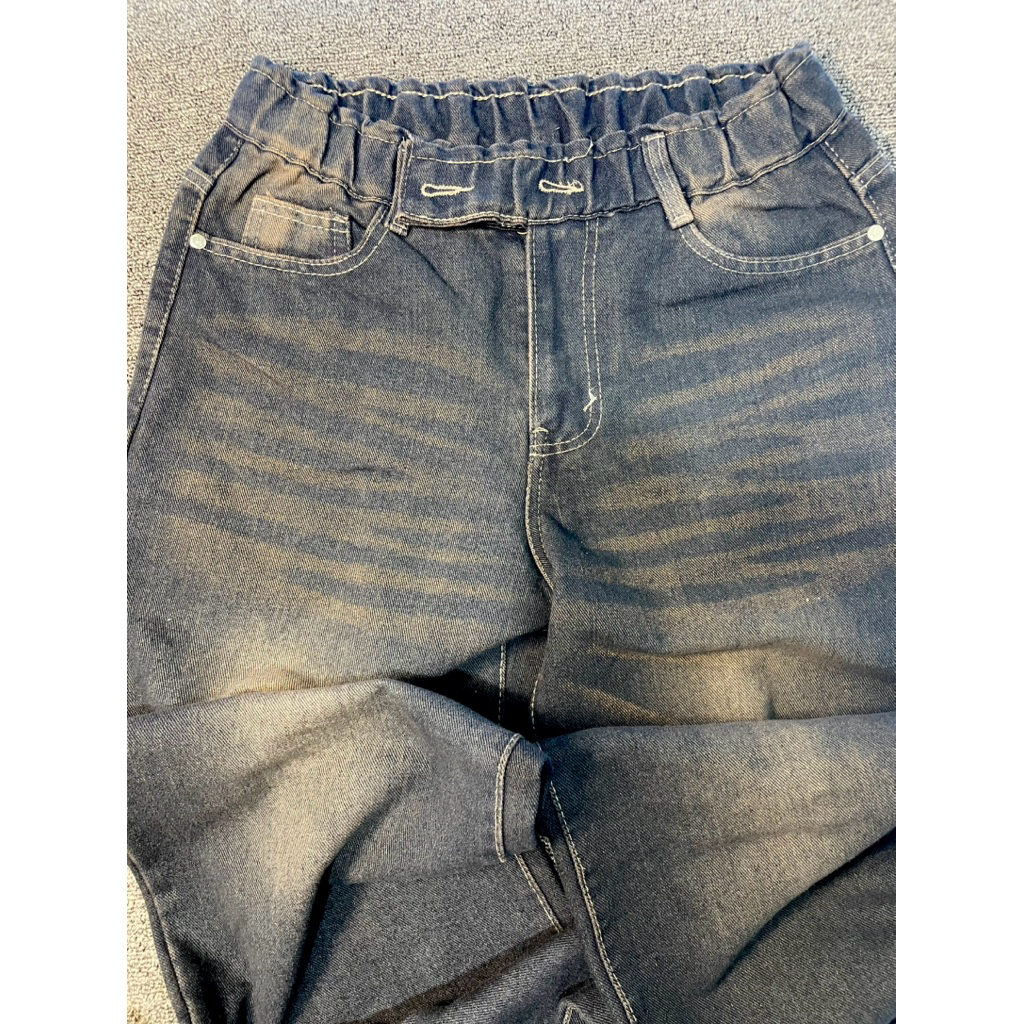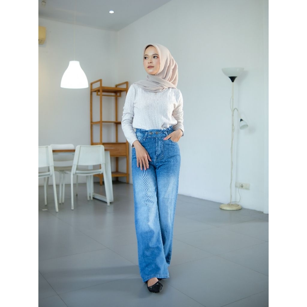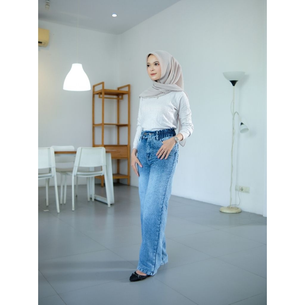 Celana Jeans Wanita Kulot High Waist Pinggang Karet Kancing 2