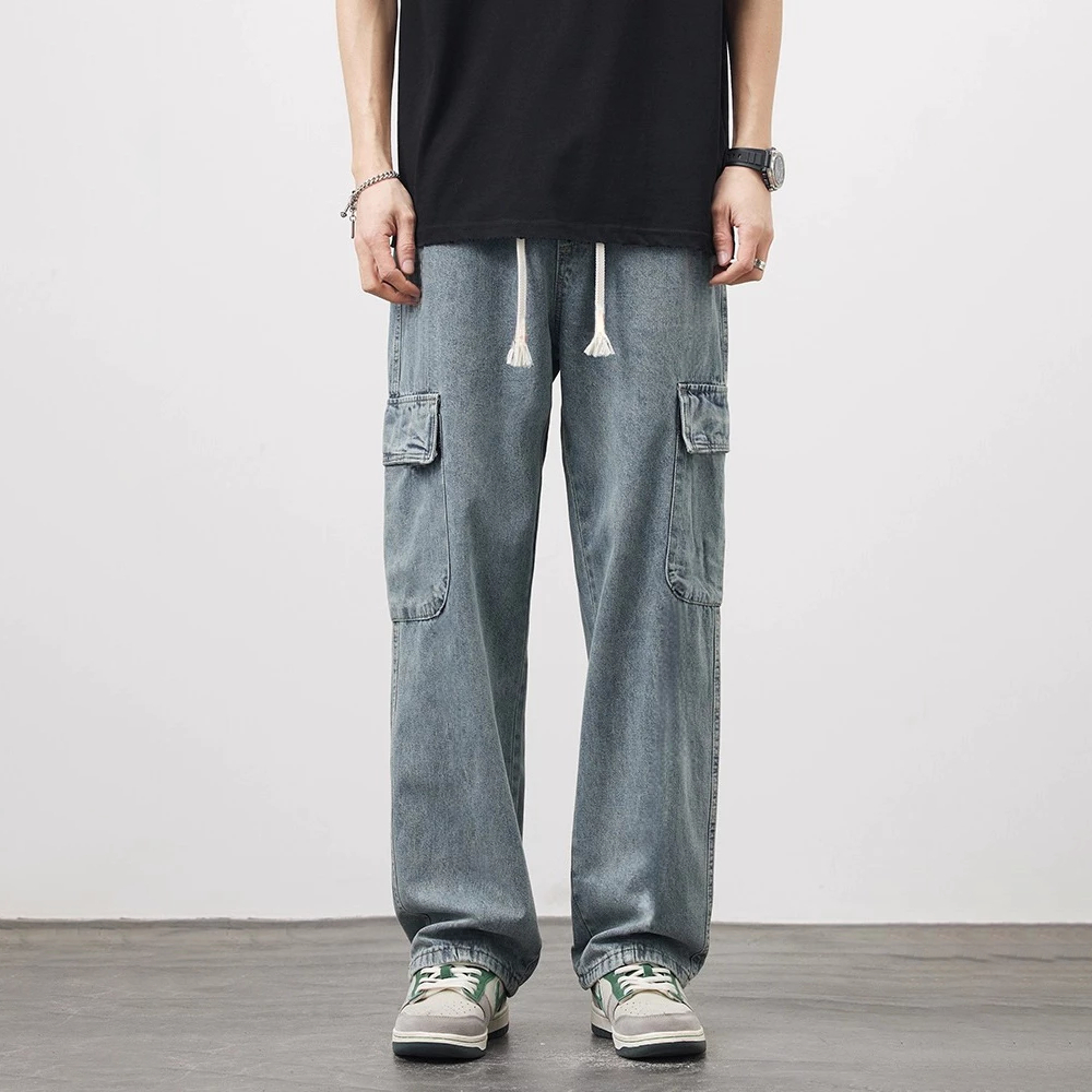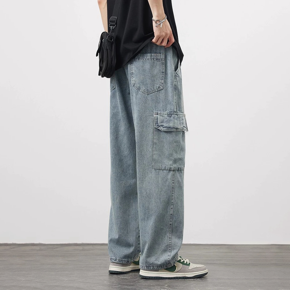 Dinn Celana Cargo Panjang Pria longgar Denim Korean Street Style Terbaru Cowok Dewasa Loose Fit Celana Jeans Pria Casual Nyaman Pinggang Elastis
