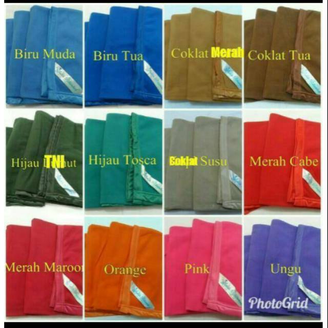 Biru muda, Biru tua, Coklat merah/muda, Coklat tua, Coklat susu, Hijau army, Hijau tosca, Merah cabe, Merah maroon, Orange