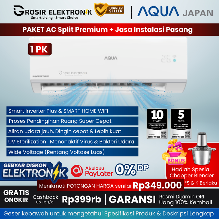 [ +PASANG ] - AC 1PK Inverter Smart WIFI Hyper PCB Self Clean [ AQUA JAPAN AQA-0.5pk-1pk ] - ac aqua 1pk - A1PK - STGE