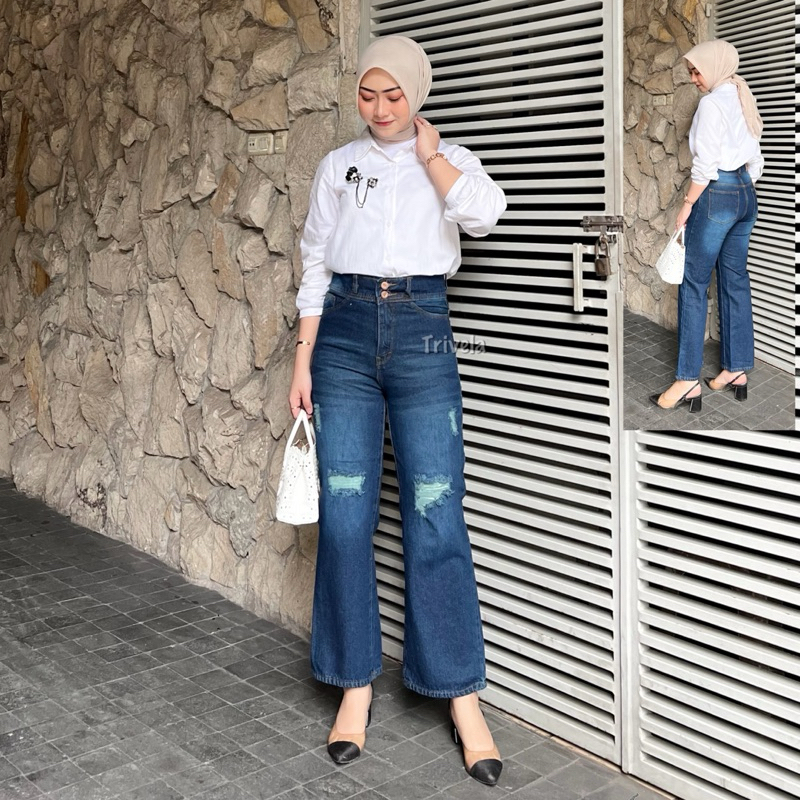 TRIVELA - Erica Cullotes Sobek Lapis | Kulot Jeans Ripped Hijab Friendly 27-42 | Jeans Wisker Wanita Highwaist Washed 27-34 / PLAINBF