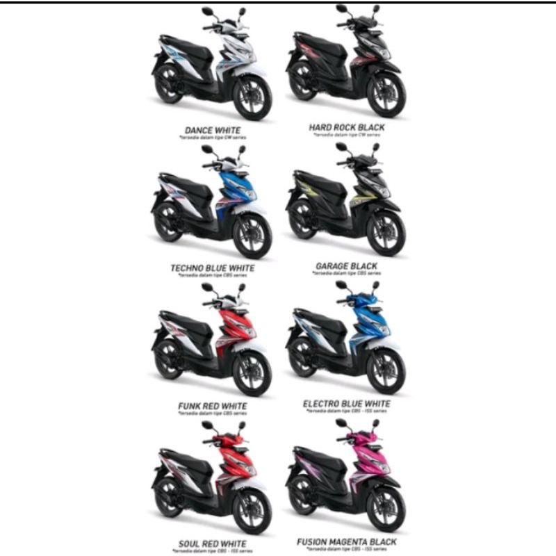 Hitam 1, Hitam 2, Hitam 3, Putih merah, Merah putih, Biru putih, Putih biru, Putih, Pink hitam, Biru hitam doff, Street putih, Street hitam glosy, Street silver, Street hitam doff, Biru putih2, Merah hitam doff, Pink hitam doff, Hitam 4, Putih merah2, Merah candi, Ungu lembayung merah, Maroon doff, Kuning, Putih 2018, Moonlight blue, Pink hitam glosy, Hitam polos, Biru putih polos, Putih polos, Merah putih polos, Putih biru polos, Pink hitam polos, Pink hitam dof polos, Hitam dof polos, Silver polos, Merah hitam dof polo, Body kasar, Pink Hitam doff2, Biru putih., Hitam, pink hitam doff 3, merah candy putihlem, biru hitam doff pls, biru hitam glosy, moonlight red, Kuning x grey, Moonlight purple, Lime green x grey, Putih lembayung gold, Golden pink x grey, Dolpin blue gold, Galaxy tosca, Hitam titanium, taro lem gold x grey, Ungu L,M x grey, Alien green, Hijau army, Almond jade, Merah grey spb vario, Limegreen xsilver, Limegreen x putihlem