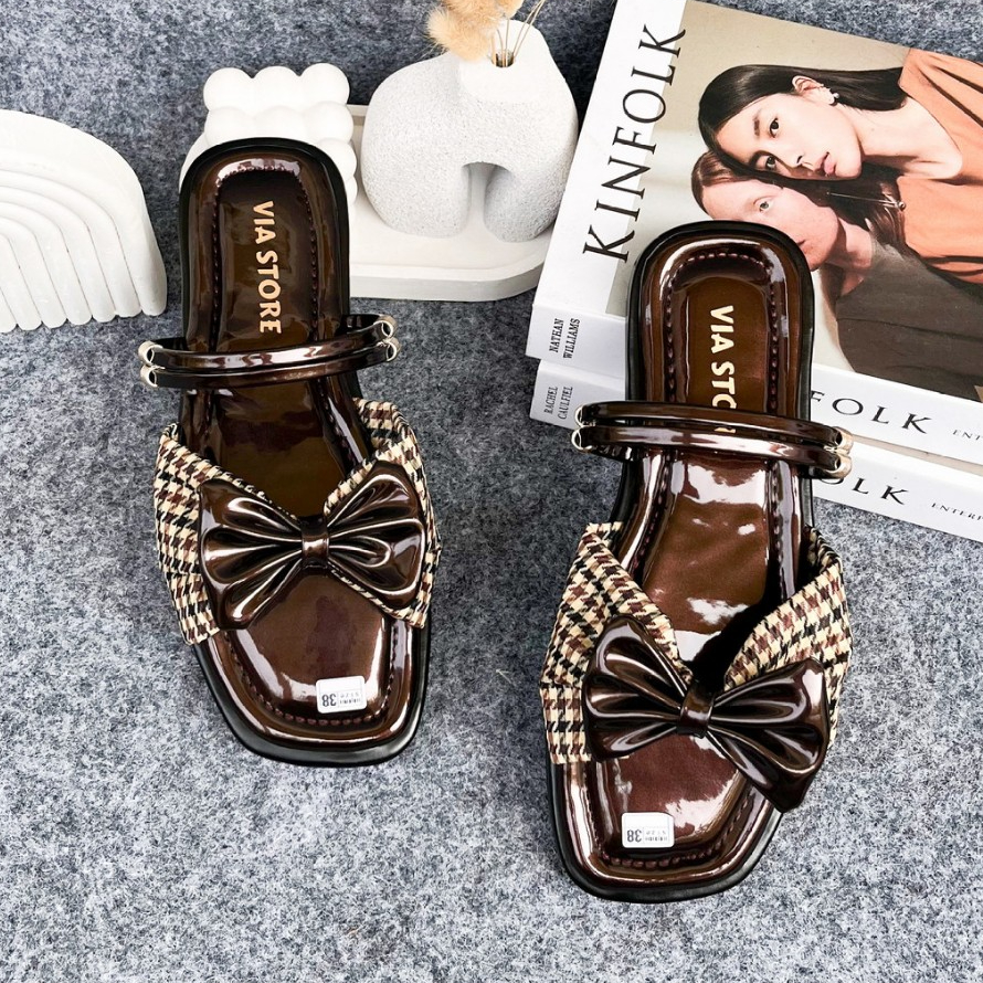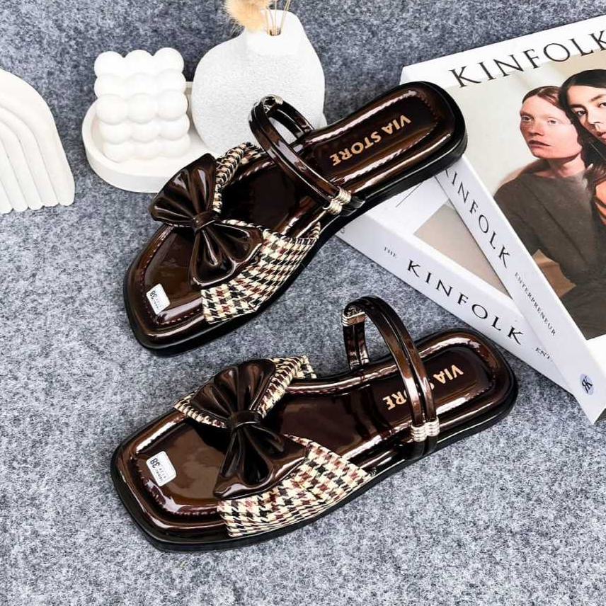 Via Store Sandal Wanita - Model Pita Korea Motif Kombinasi Kulit & Motif Houndstooth Bow