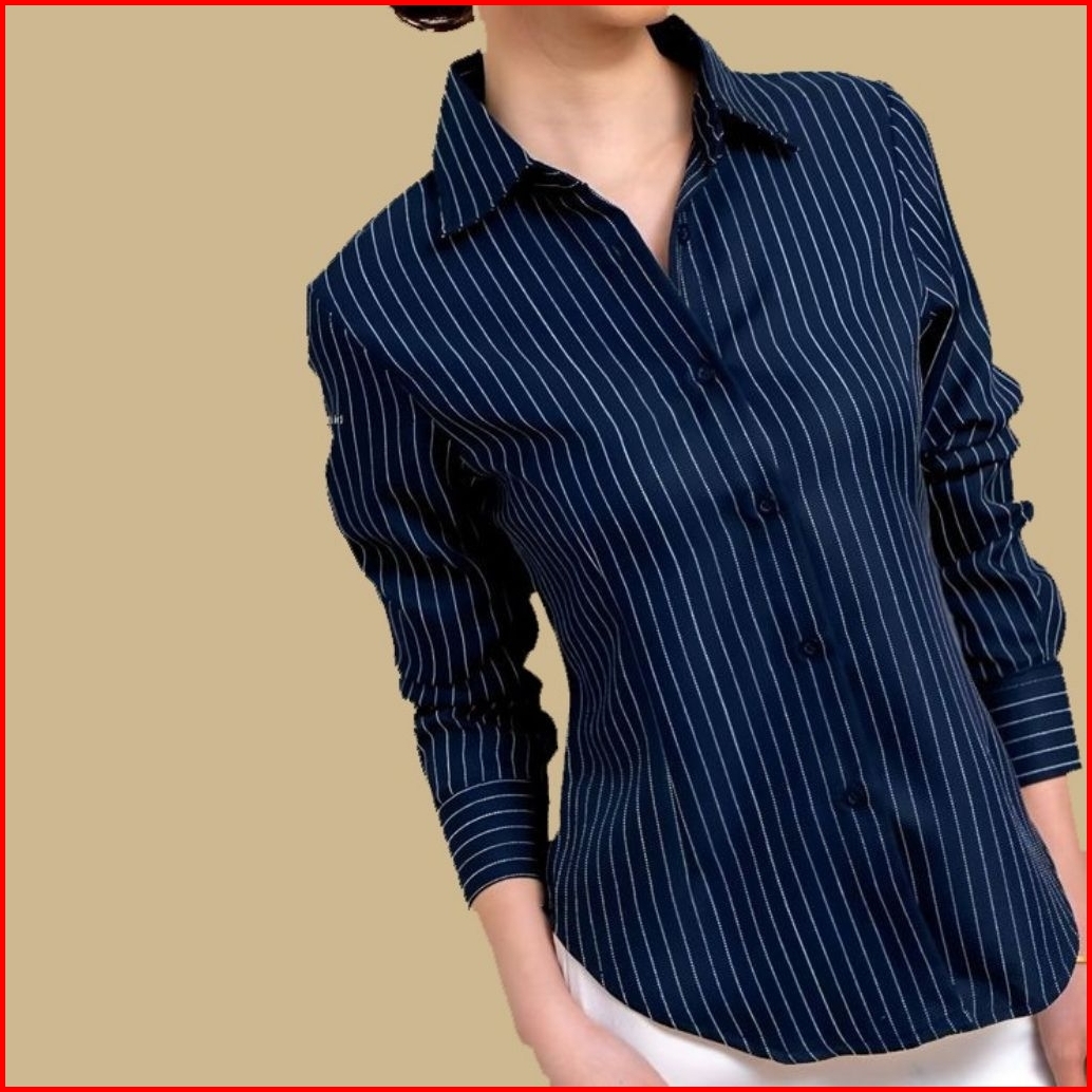 Olivra Luna Stripe Fitted Shirt - Kemeja Wanita - Atasan Wanita Stripe Salur - Kemeja Basic Lengan Panjang - Kemeja Kant