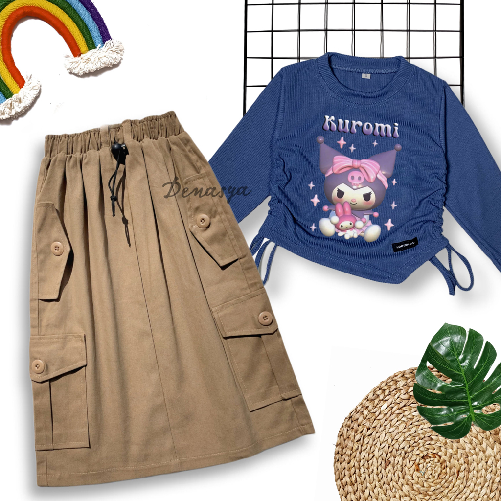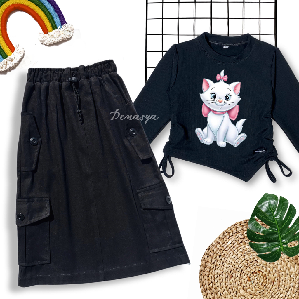 SETELAN OOTD KNIT ANAK PEREMPUAN TERBARU / KAOS KNIT SERUT MOTIF SABLON / ROK CARGO KATUN IMPORT 2-12 TAHUN