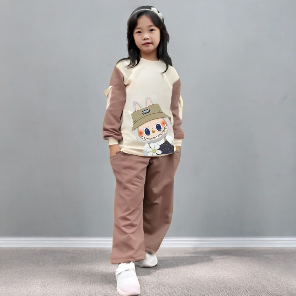 Setelan Baju Anak Perempuan Set Cargo Kartun Labubu Terbaru Usia 5-12 Tahun Celana Cargo Terbaru