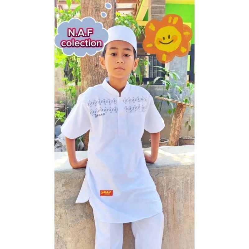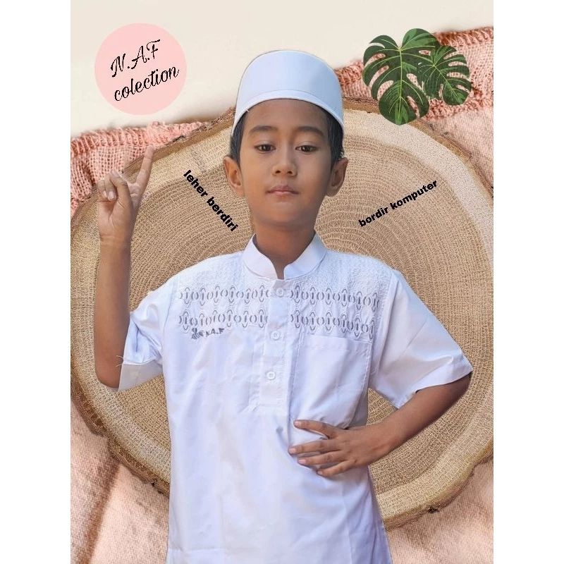 BAJU KOKO PUTIH ANAK LAKI LAKI LENGAN PENDEK MOTIF BORDIR ABU 3-12 TAHUN FREE PECI KATUN POLIMICRO// BAJU MUSLIM ANAK PU
