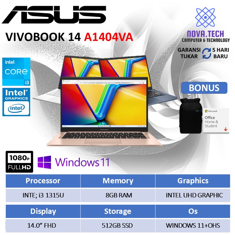 Asus Vivobook 14 A1404VA Laptop Intel Core i3 1315 Gen 13th Ram 8gb 512GB Ssd Windows 11 + OHS Layar 14.0fhd