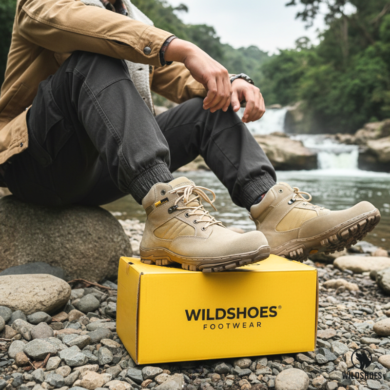 Sepatu Pria Boots Safety Ujung Besi - Cordura Tactical Krem Hitam - Sepatu Safety Pria Outdoor Tracking - WildShoes Offi