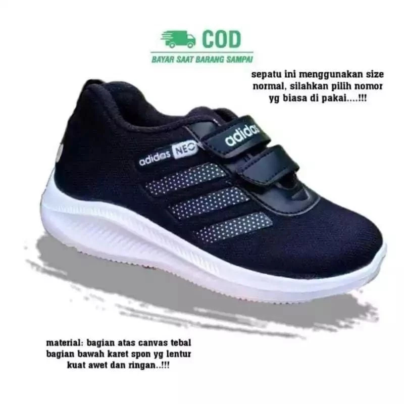 SEPATU ANAK SEKOLAH HITAM ADIDAS//NIKE BORDIL USIA 4-15 UKURAN 27-38 VELCRO TANPA TALI TERLARIS//TERBAIK