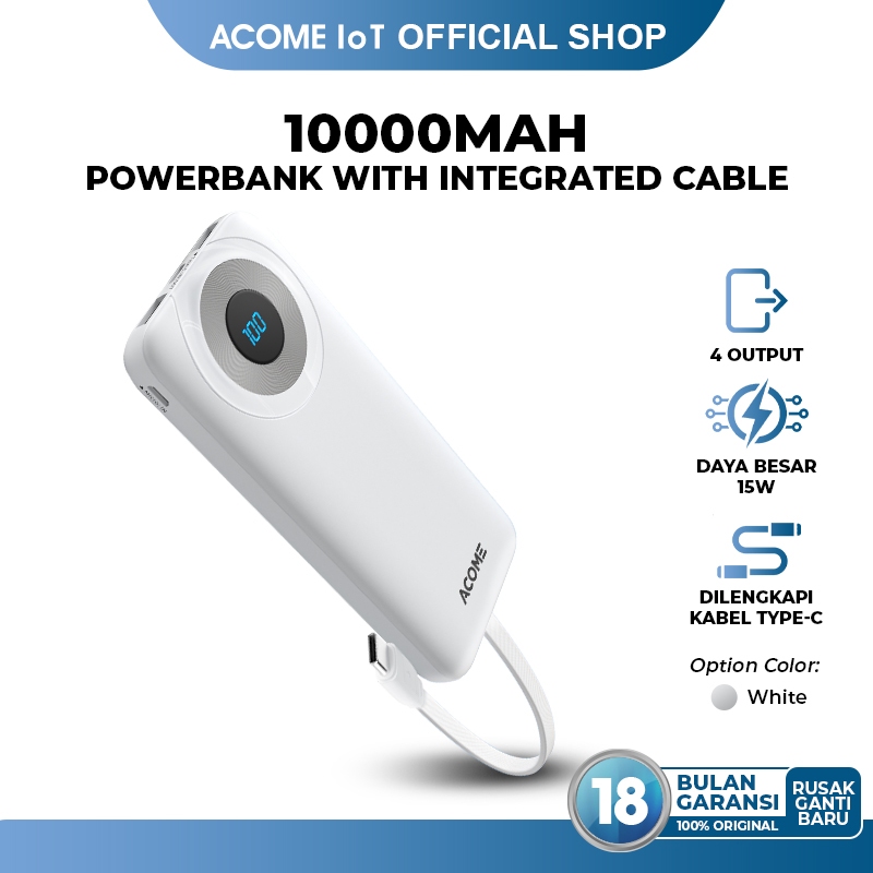 ACOME Powerbank 10000 mAh AP112 4 Output Fast Charging 15W dengan Kabel Type-C Bawaan LED Display Original - Garansi 18