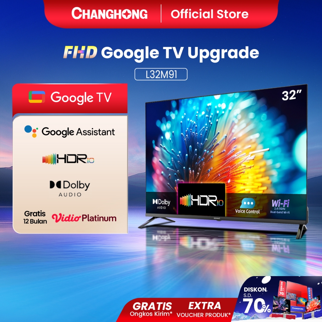 Changhong Google TV L32M91 FHD New Edition 32 inch FHD Dolby Audio Google Play Netflix Youtube Android 14 Bluetooth USB Google Assistant Smart TV Digital TV Free Vidio L32M91 FHD New Edition