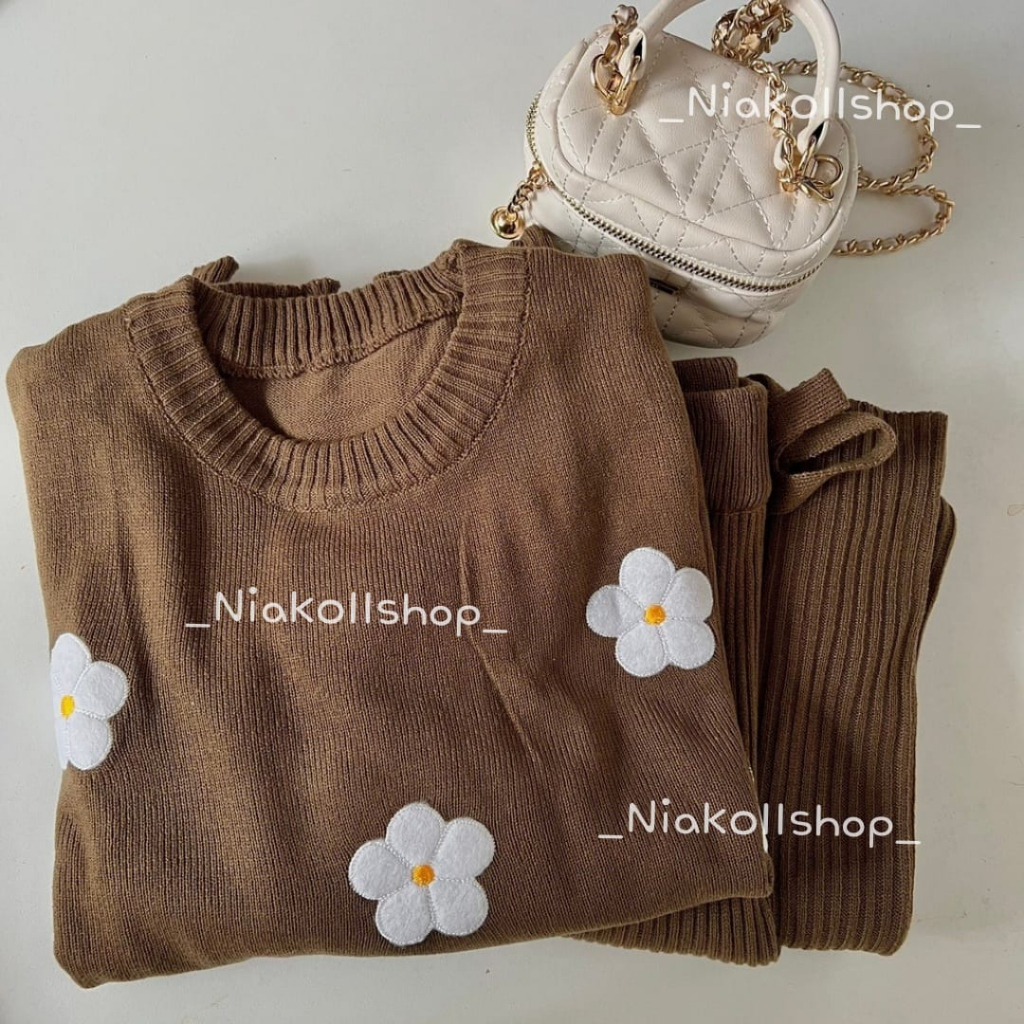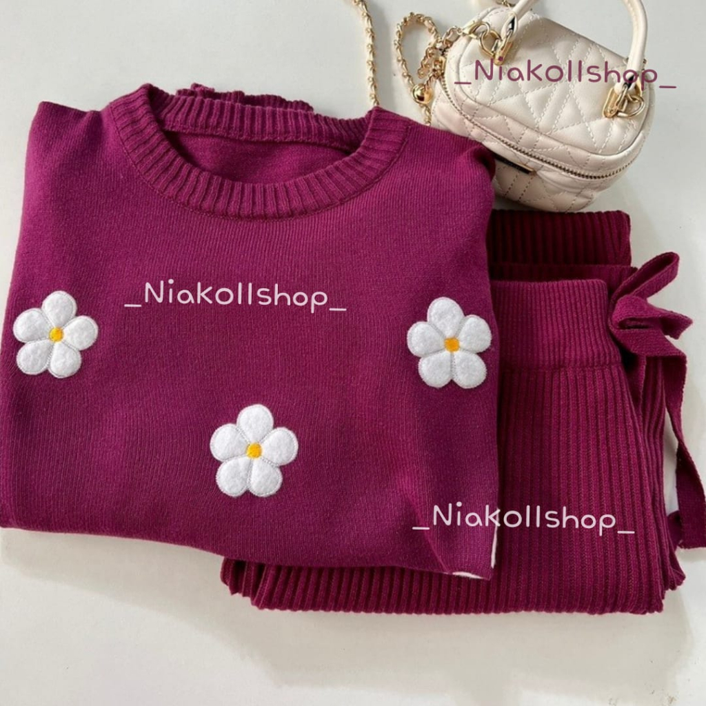 NIAK - One Set Celana Kulot & Sweater Arra Flowers Rajut Premium | Setelan Rajut | Oneset Rajut Bunga Atasan Bawahan Wan