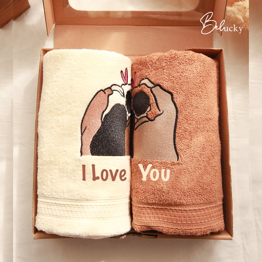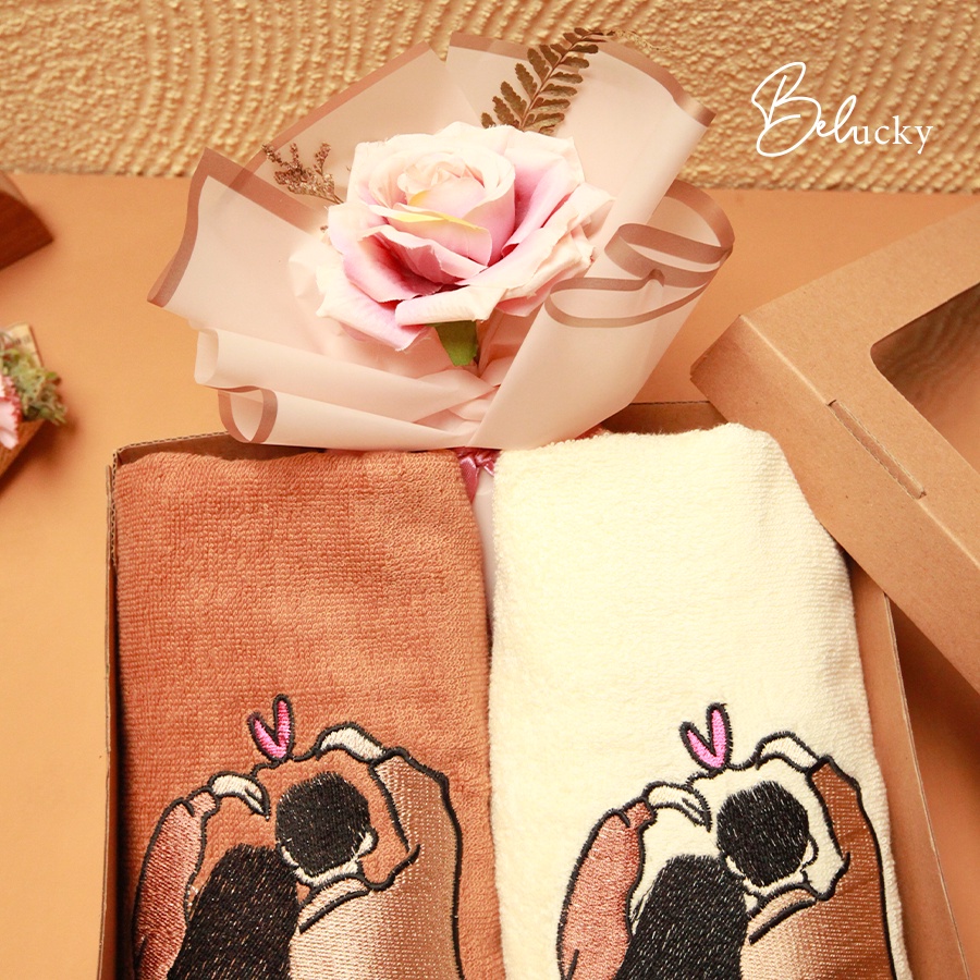 Handuk Couple Seserahan Hampers Ready Bordir Pasangan Gift Set Box Kado Pernikahan Wedding Gift + Box + Kartu ucapan- LOVE YOU