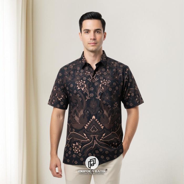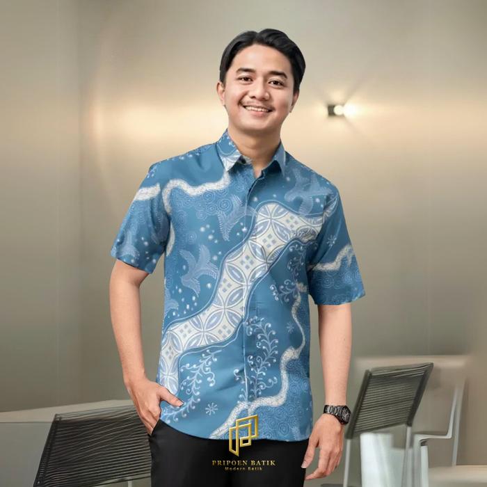 Pripoen KEMEJA BATIK PRIA MOTIF BIRU DENIM - KEMEJA BATIK PENDEK LENGAN PENDEK Baju Cowok V-Neck kemeja lengan Katun