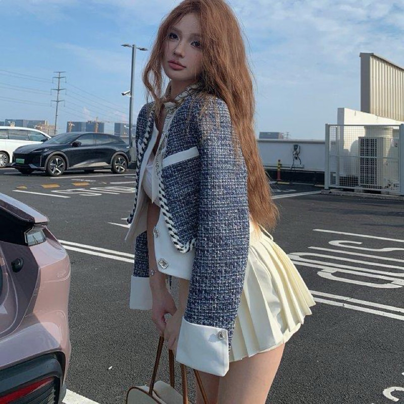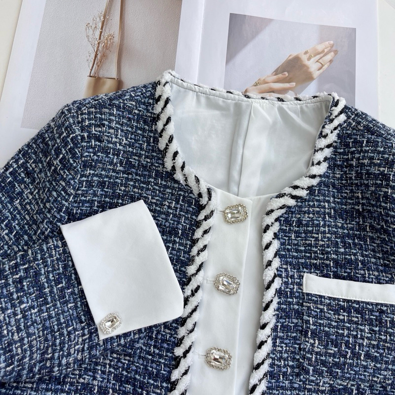 THE0NE || Fashionable Crop Blazer Tweed Fake Two Piece Tweed Buttons Premium High Quality S-2XL