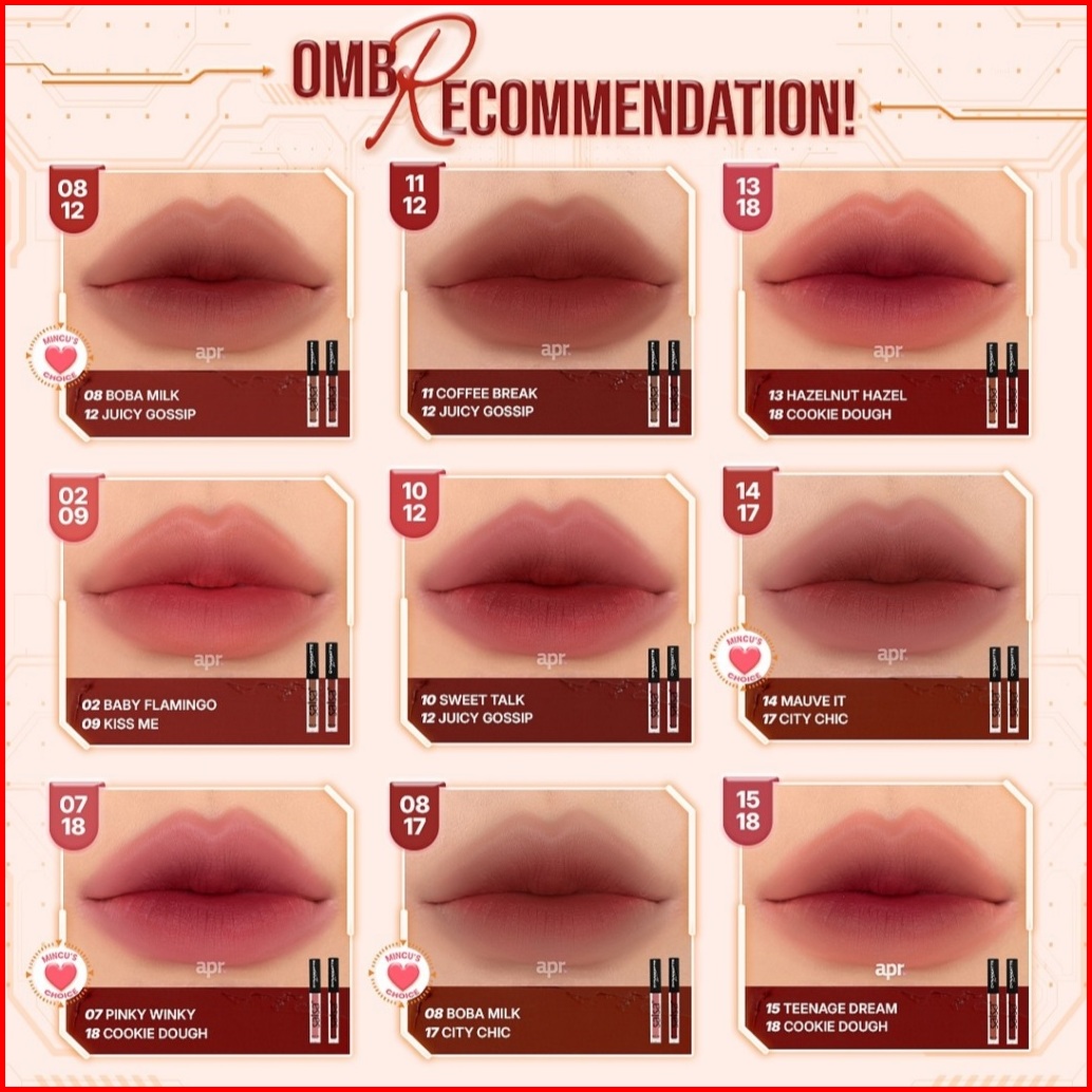 01 Innocent Lady, 02 Baby Flamingo, 03 Pink Champagne, 04 Angel Crush, 05 Cherry Bomb, 06 Passionate Red, 07 Pinky Winky, 08 Boba Milk, 09 Kiss Me, 10 Sweet talk, 11 Coffe Break, 12 Juicy Gossip, 13 Hazelnut Hazel, 14 Mauve It, 15 Teenage Dream, 16 Honey Butter, 17 City Chic, 18 Cookie Dough