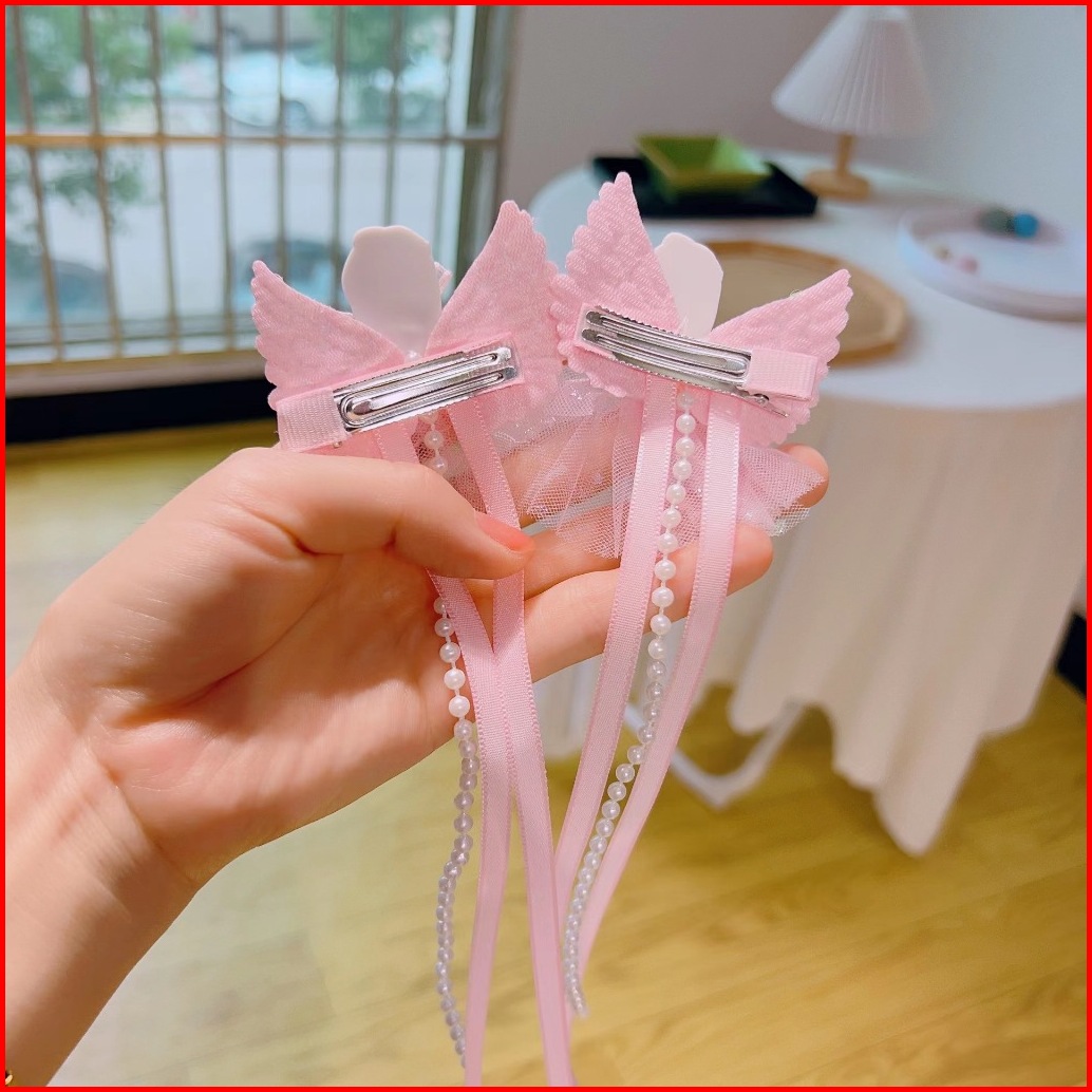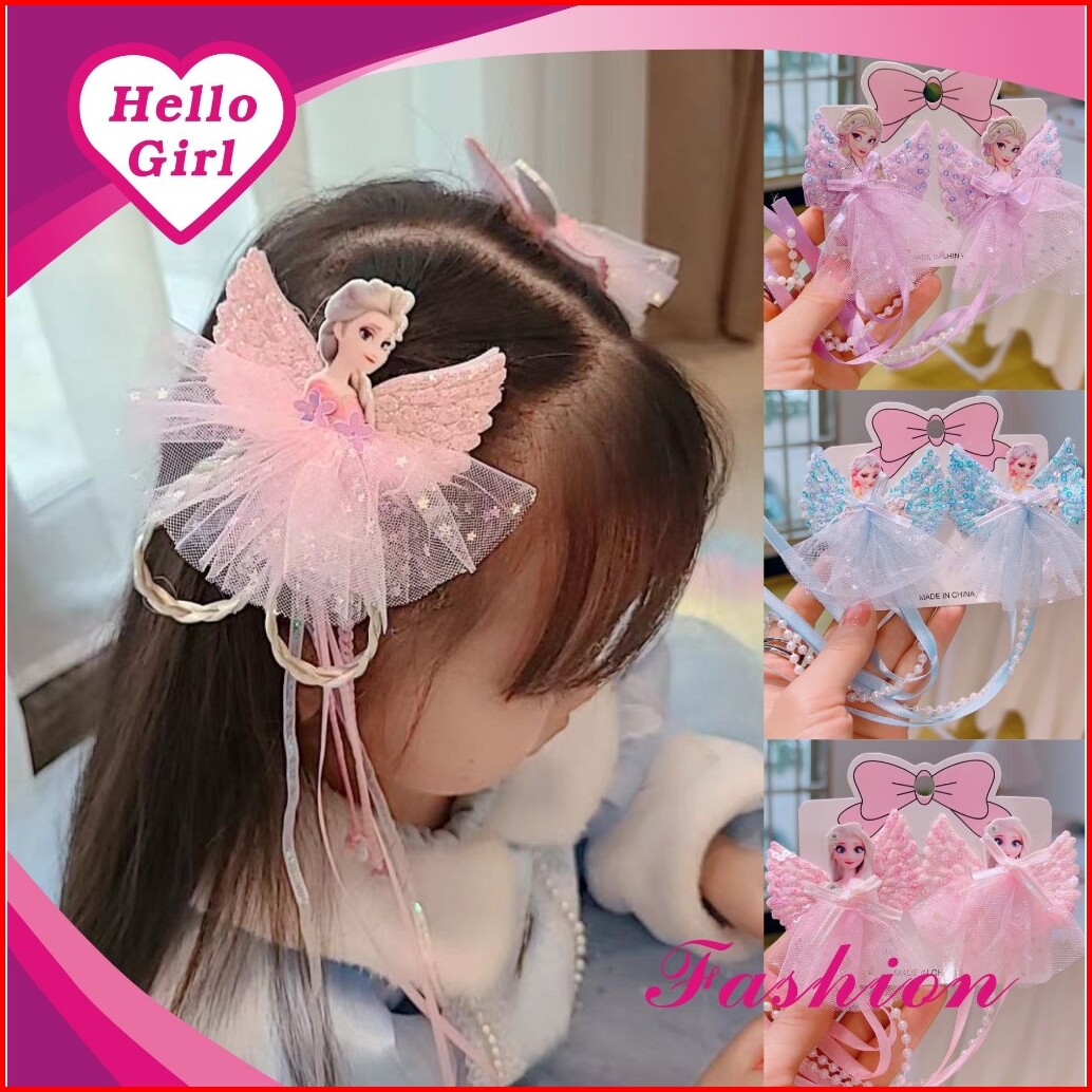 Hello Girl F324 Sepasang Jepit Rambut Anak Motif Sayap Elsa Pita Panjang Import