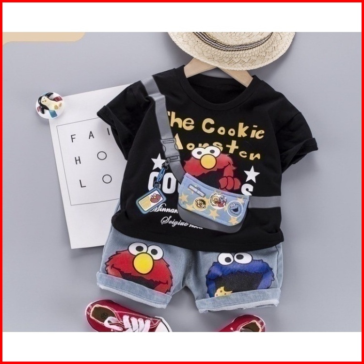 Store.1234 Setelan Baju Anak 1-4thn Set Wangki Kerah Celana Jeans Sesame Street.