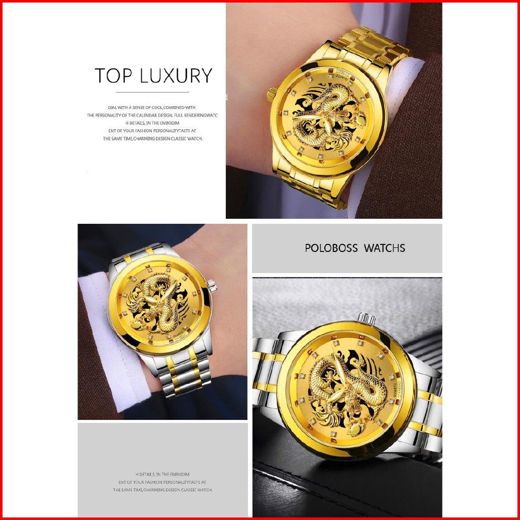 Holek Jam Tangan Pria Naga Luxury Stainless Steel Quartz Original Anti Air Dragon Watch Kuning