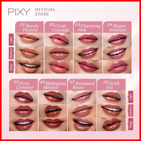 01 Barely Peachy, 02 Coral Courage, 03 Charming Pink, 04 Mauve Ambition, 05 Fiery Crimson, 06 Mahogany Mission, 07 Rosewood Blaze, 08 Brick Era
