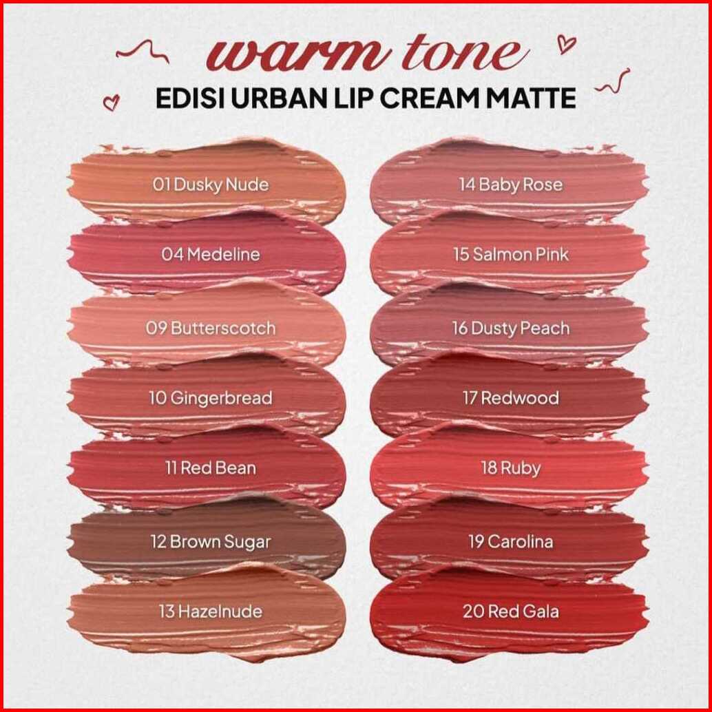 01 Dusky Nude, 02 Terra Cotta, 03 Dark Berry, 04 Medeline, 05 Allure, 06 Lumiere, 07 Truffle Mauva, 08 Pink Latte, 09 Butterscotch, 10 Gingerbread, 11 Red bean, 12 Brown Sugar, 13 Hazelnude, 14 Baby Rose, 15 Salmon Pink, 16 Dusty Peach, 17 RedWood, 18 Ruby, 19 Carolina, 20 Red Gala, 19 Carolina NOBOX, 01 Dusky Nude NOBOX, 16 Dusty Peach NOBOX, 18 Ruby NOBOX