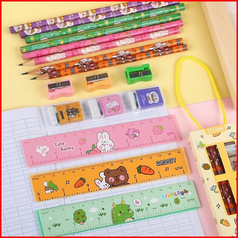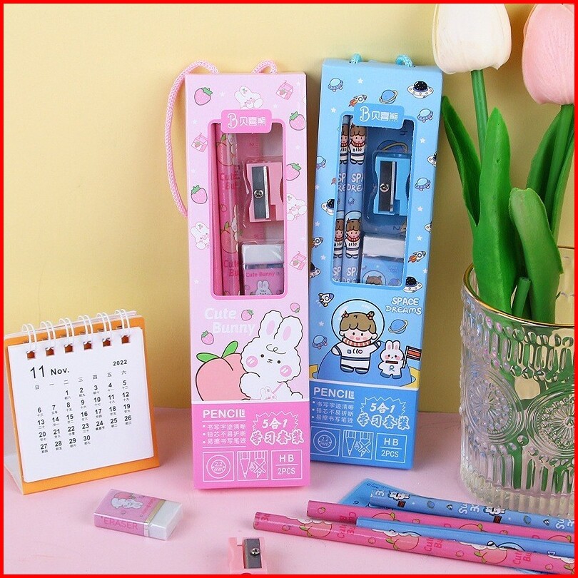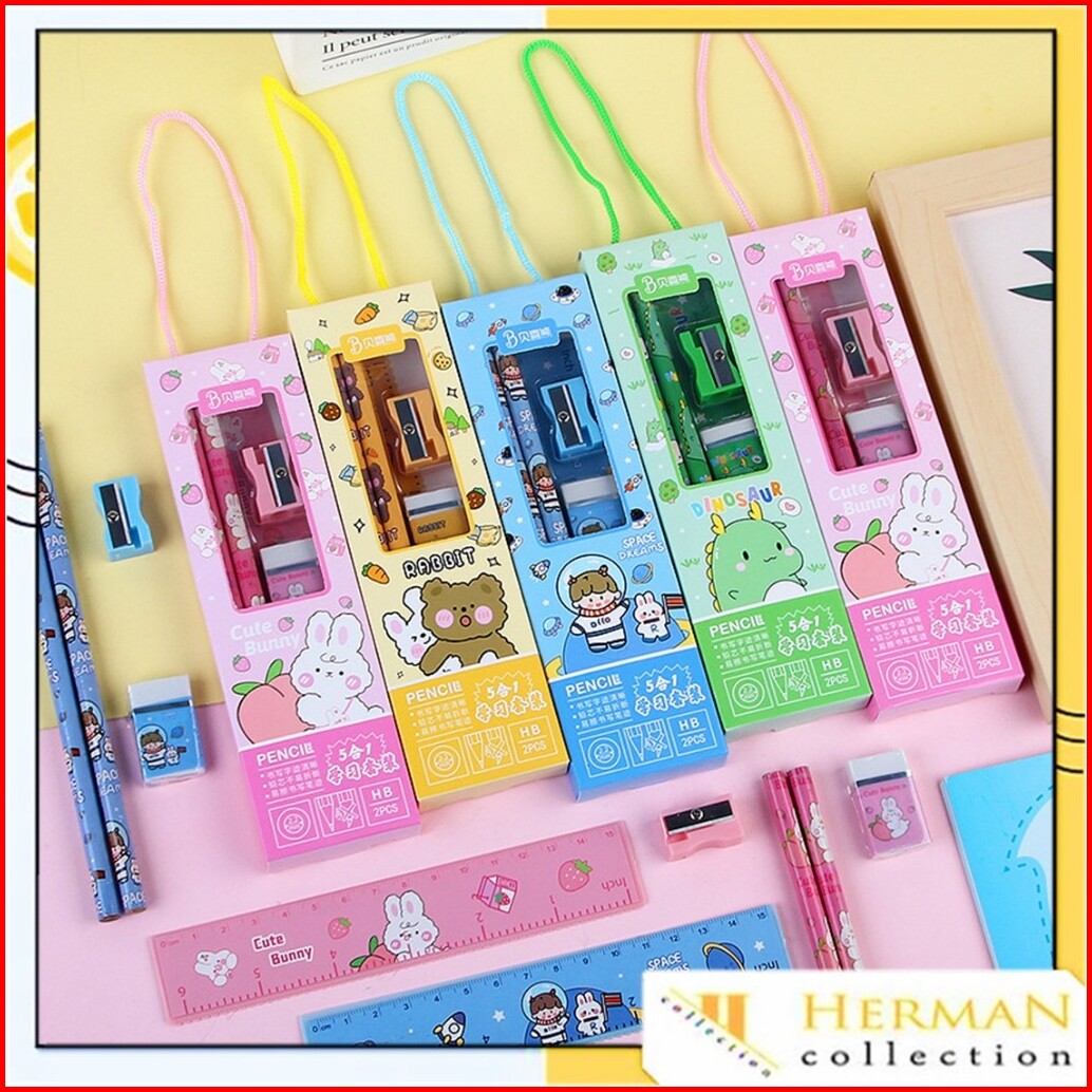 Hc Stationery Set 5 In 1 Alat Tulis Anak Sekolah Penghapus Penggaris Pensil Serutan Karakter Lucu Set Alat Tulis Anak Mo