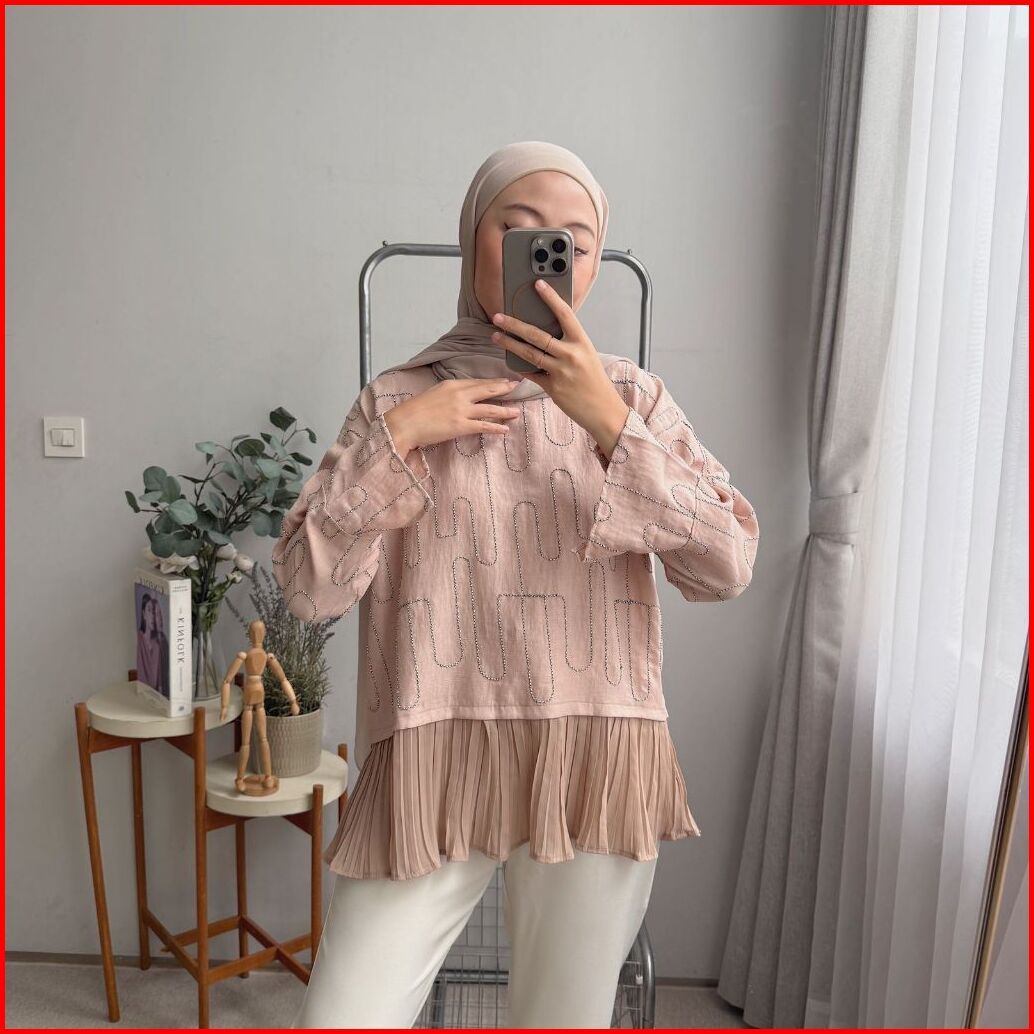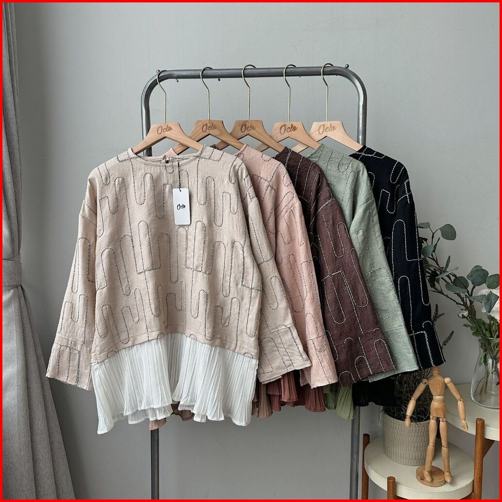Oclo Evelyn Blouse Bordir Wanita Casual Lengan Panjang Atasan Plisket Premium Ocl01583