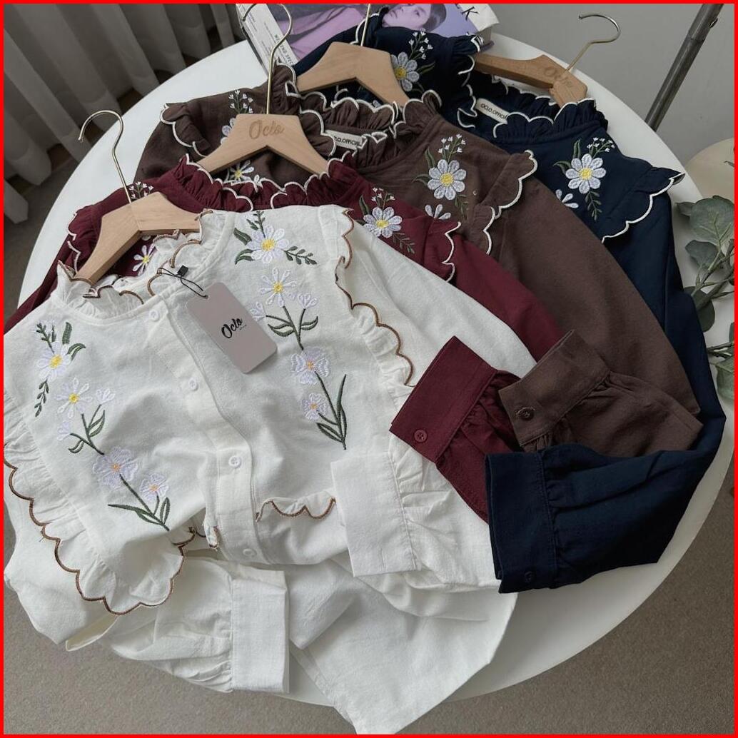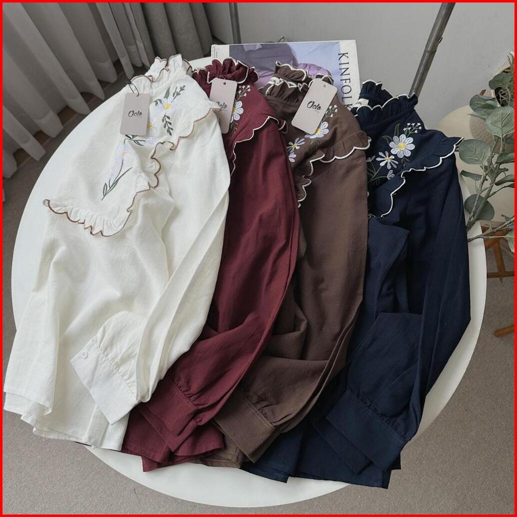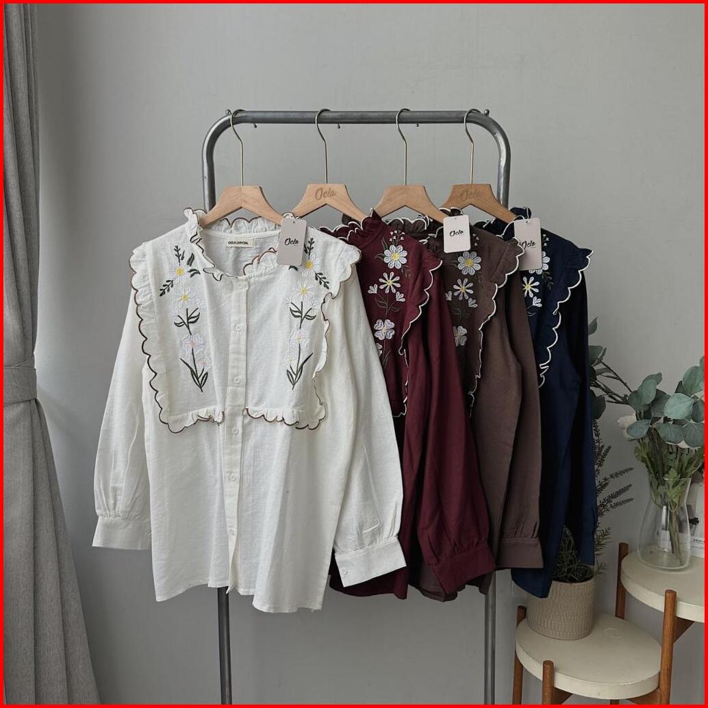 Oclo Evaza Shirt Kemeja Wanita Bordir Bunga Linen Premium Lengan Panjang Ocl02553