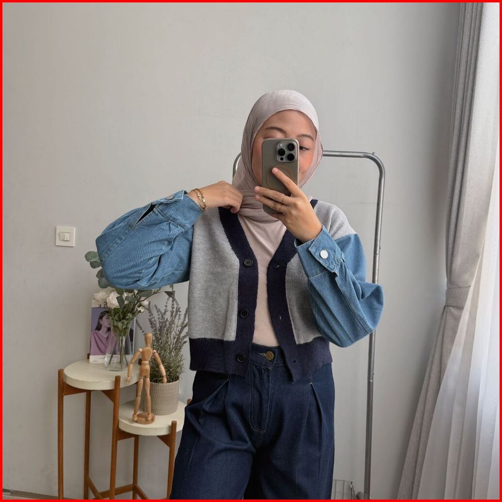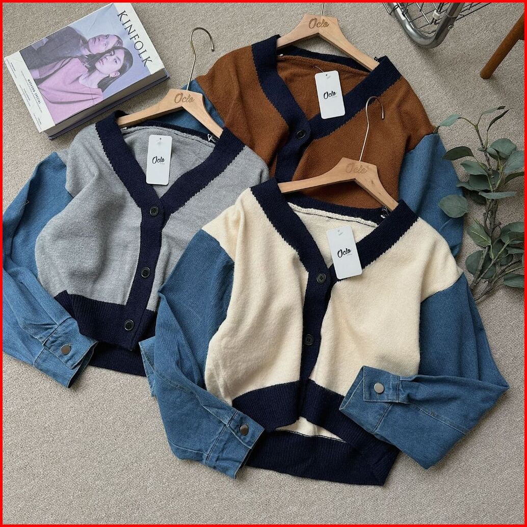 Oclo Elleisha Cardi Stripe Knit Mix Jeans Casual Atasan Blouse Wanita Rajut Denim Lengan Panjang Ocl02821