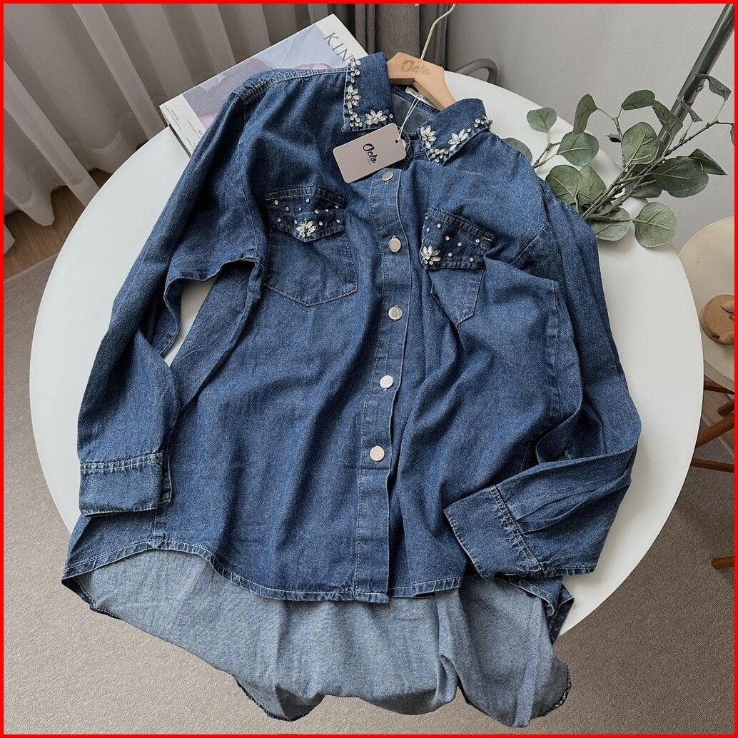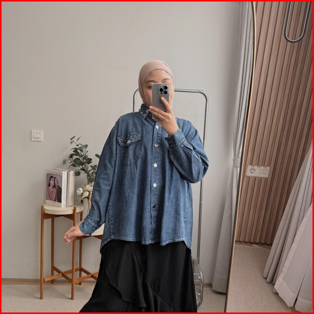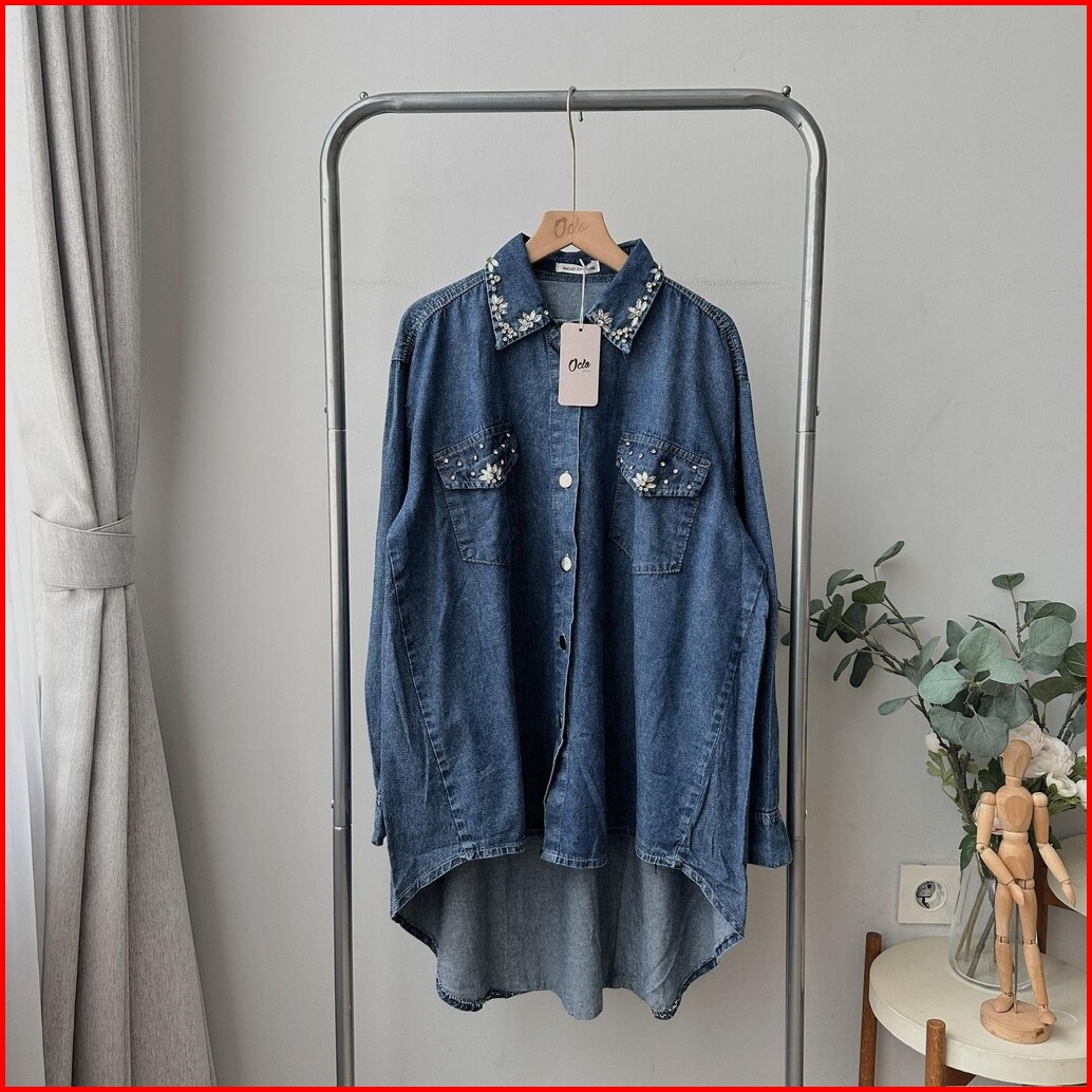 Oclo Teysa Shirt Jeans Manik Casual Basic Atasan Kemeja Wanita Denim Lengan Panjang
