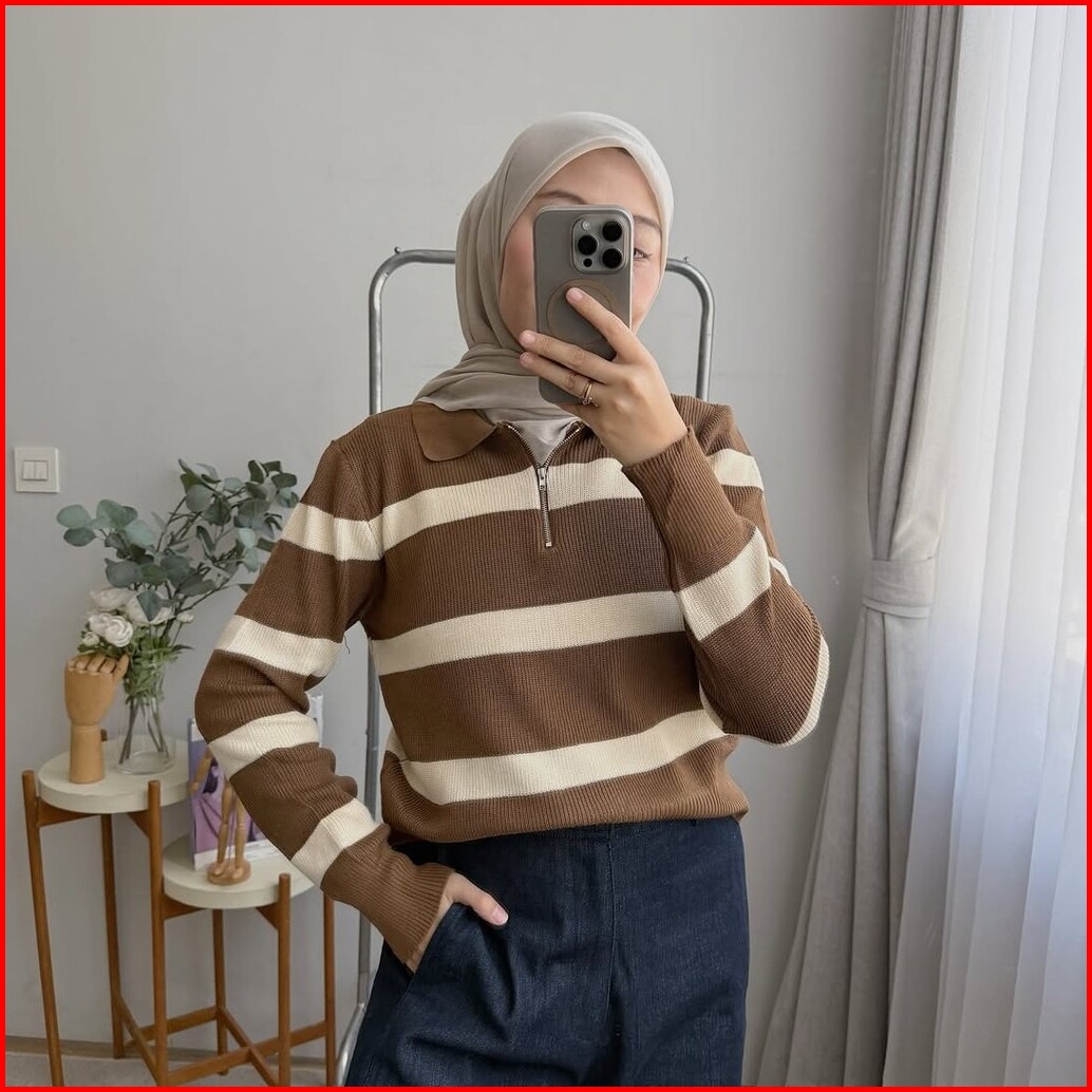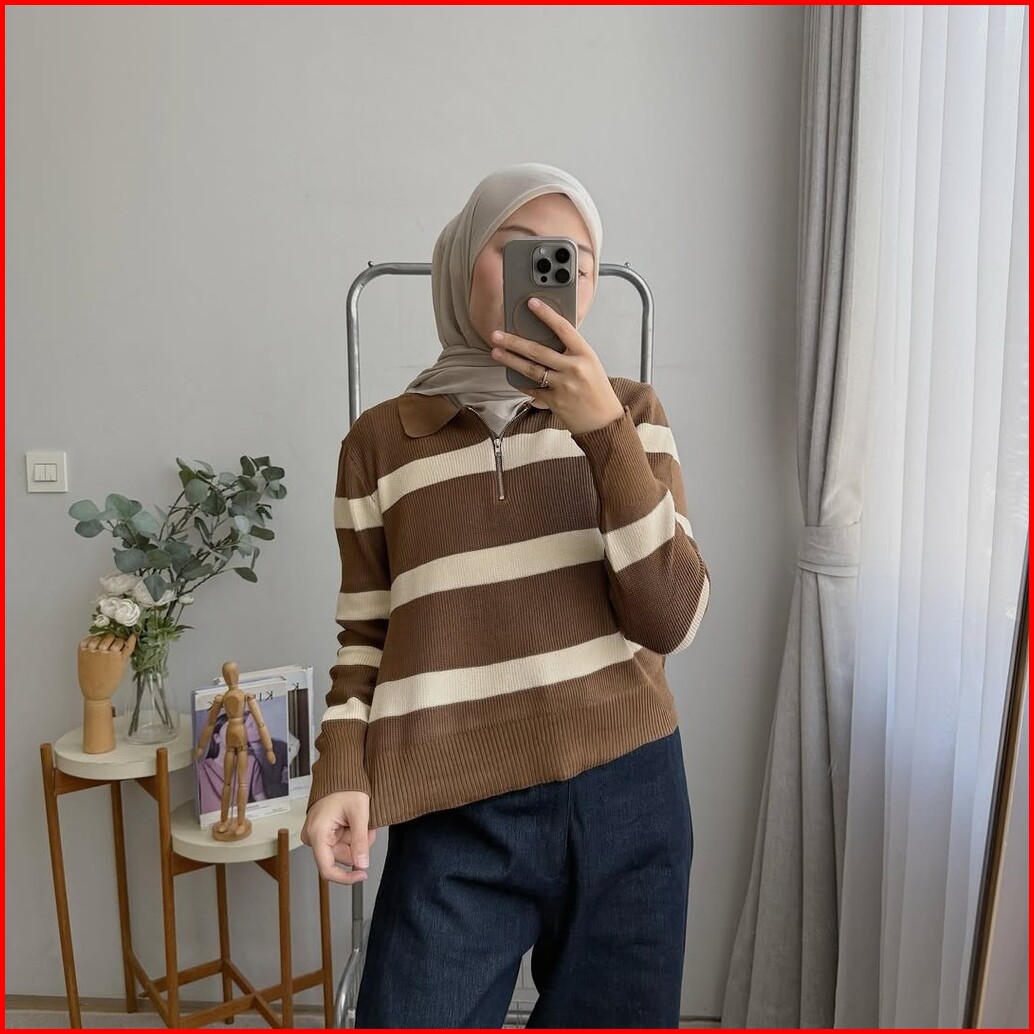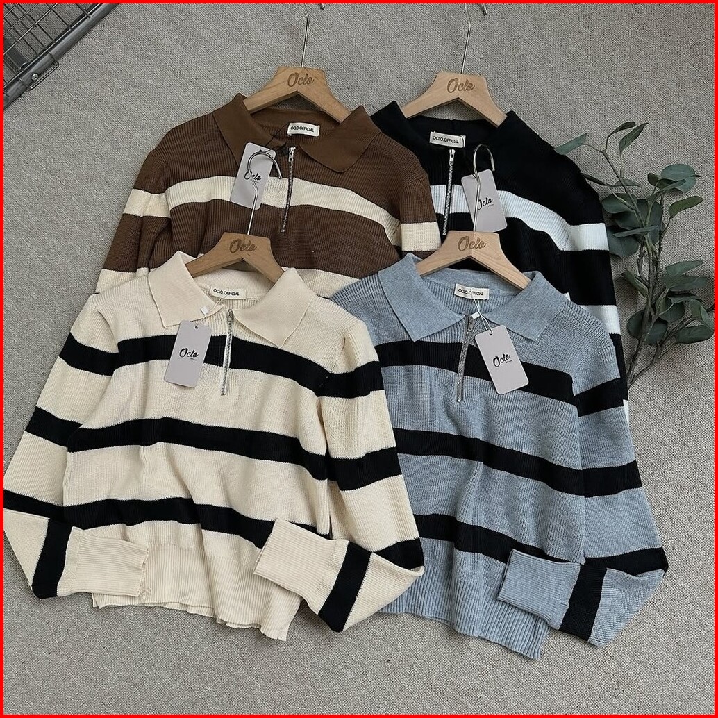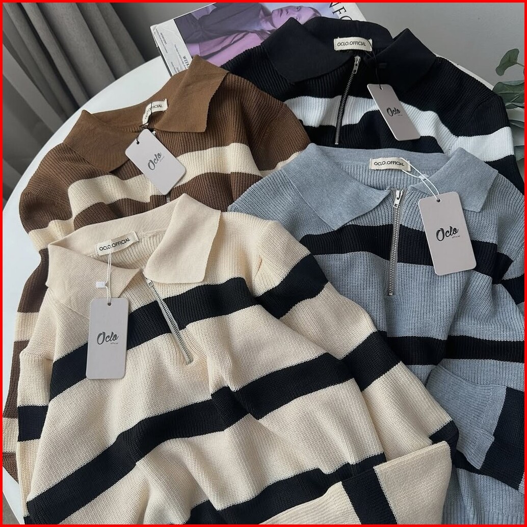 Oclo Lindie Sweater Knit Rajut Stripe Resleting Casual Basic Dailywear Atasan Wanita Ocl02998