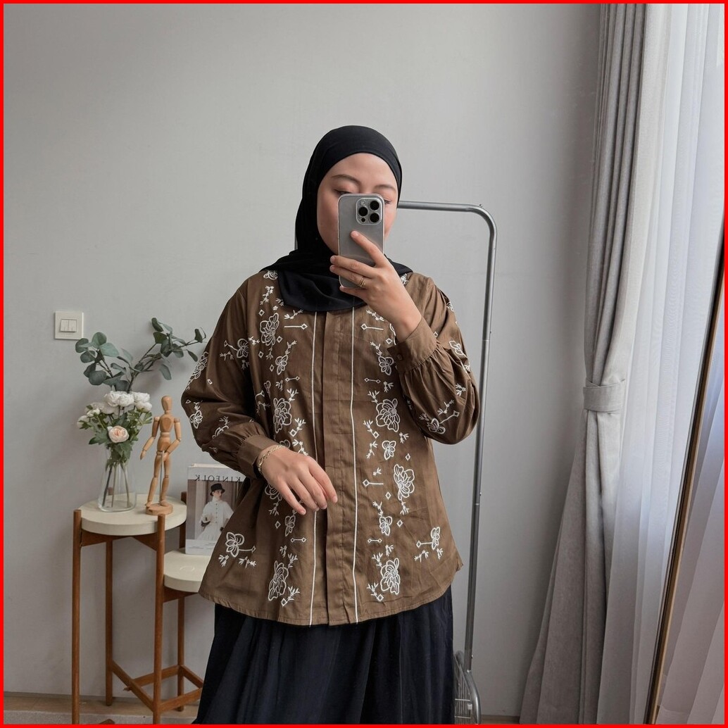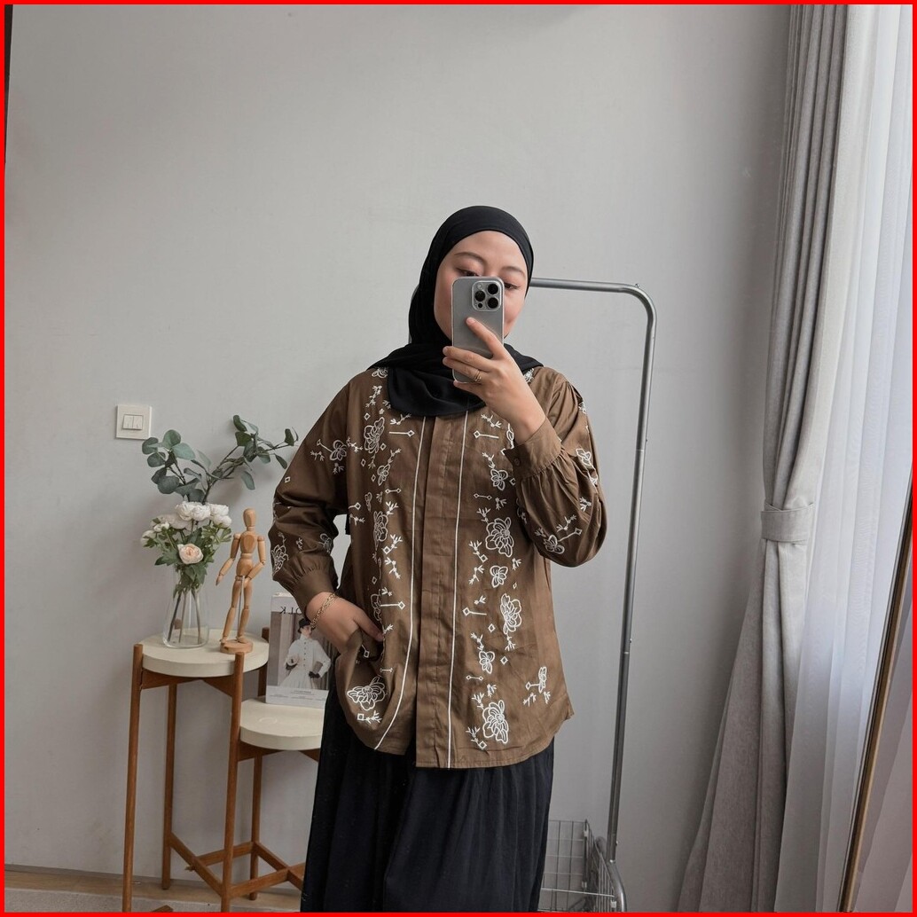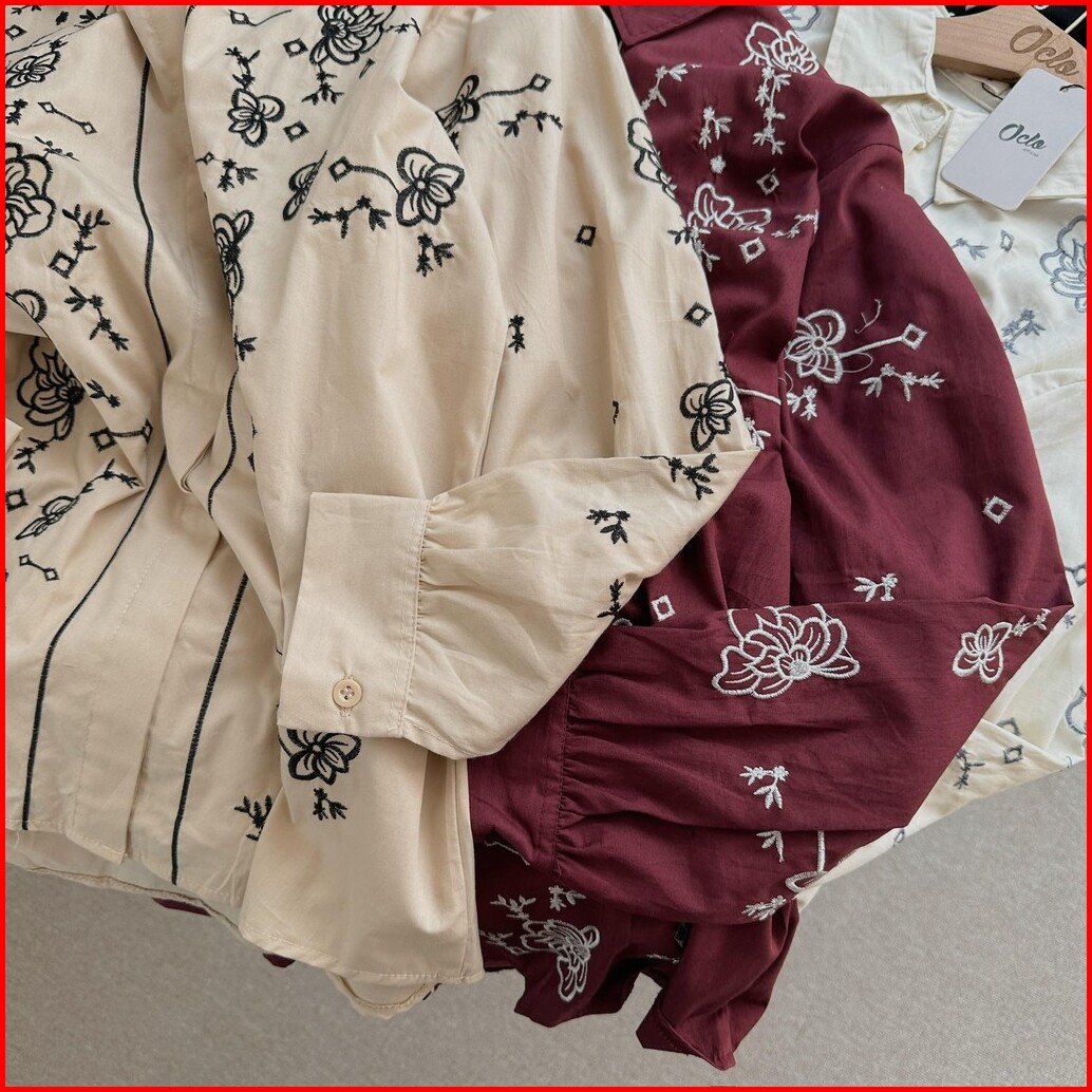 Oclo Adita Shirt Embroidery Casual Basic Atasan Kemeja Wanita Katun Bordir Bunga Lengan Panjang Ocl02443