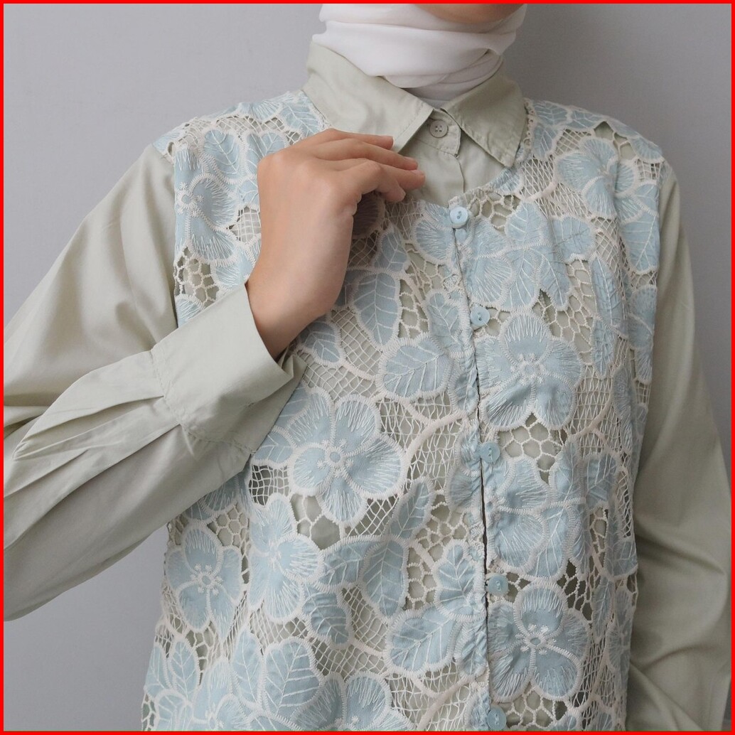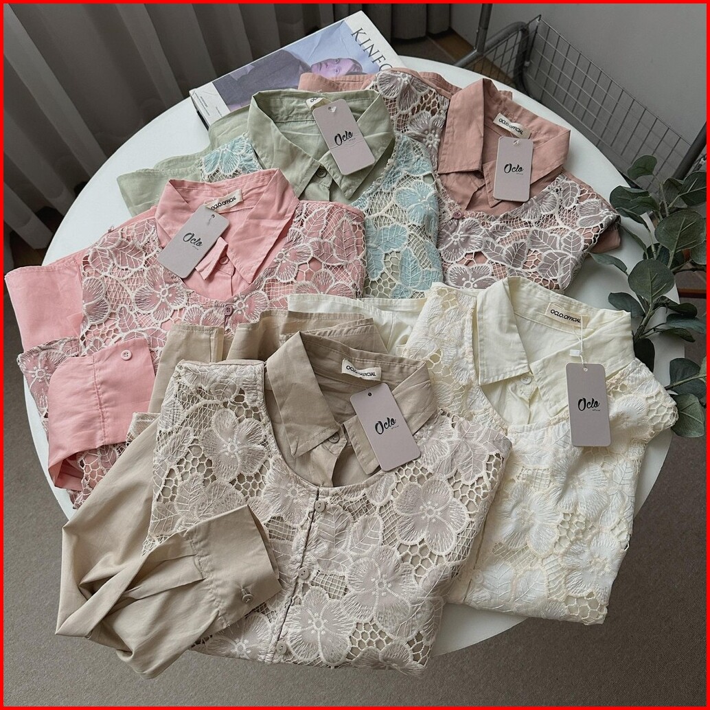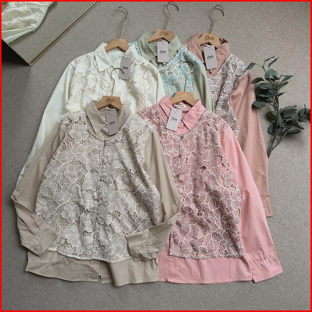 Oclo Chara Shirt Mix Lace Atasan Kemeja Katun Brukat Renda Wanita Lengan Panjang Ocl02511
