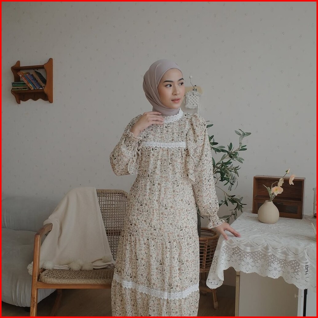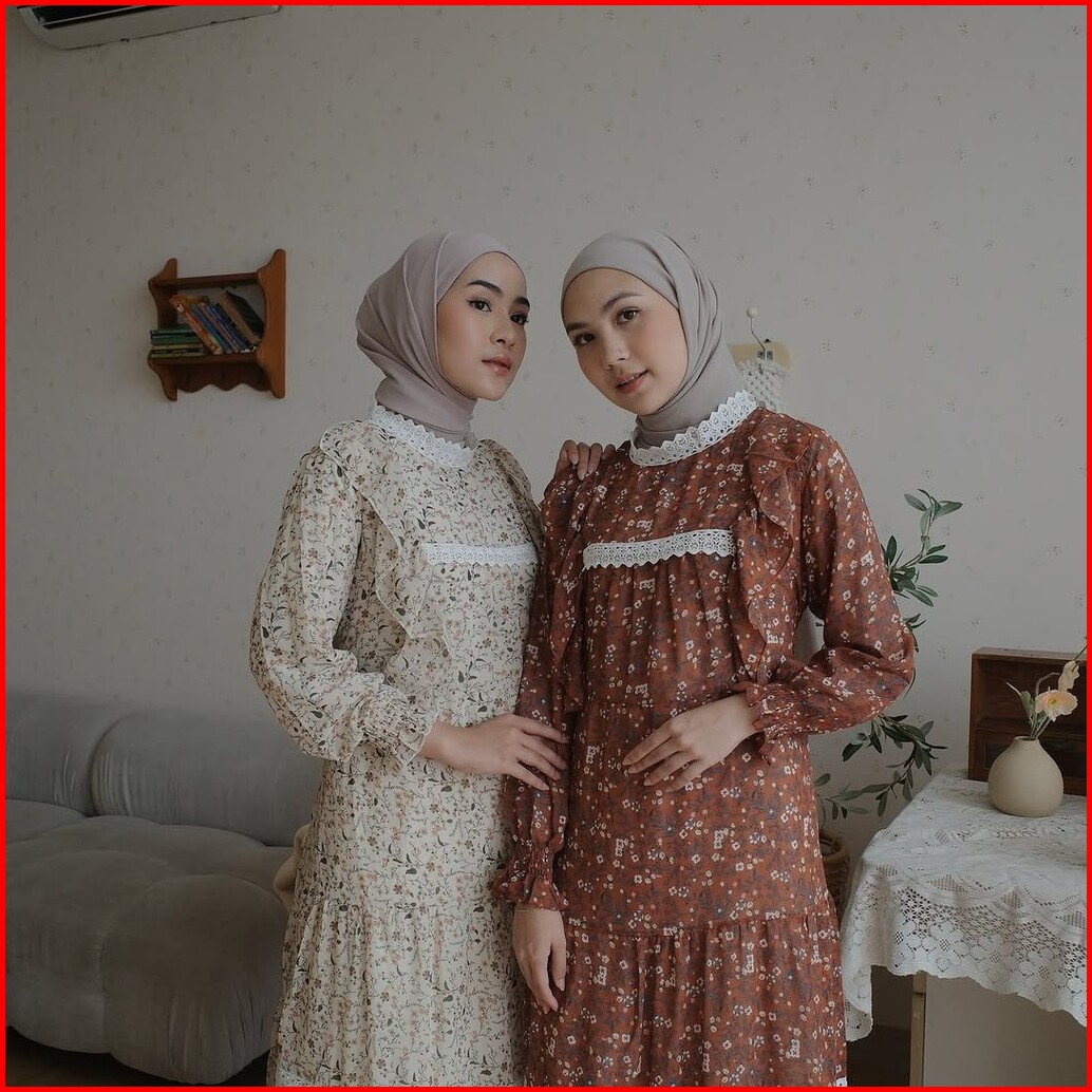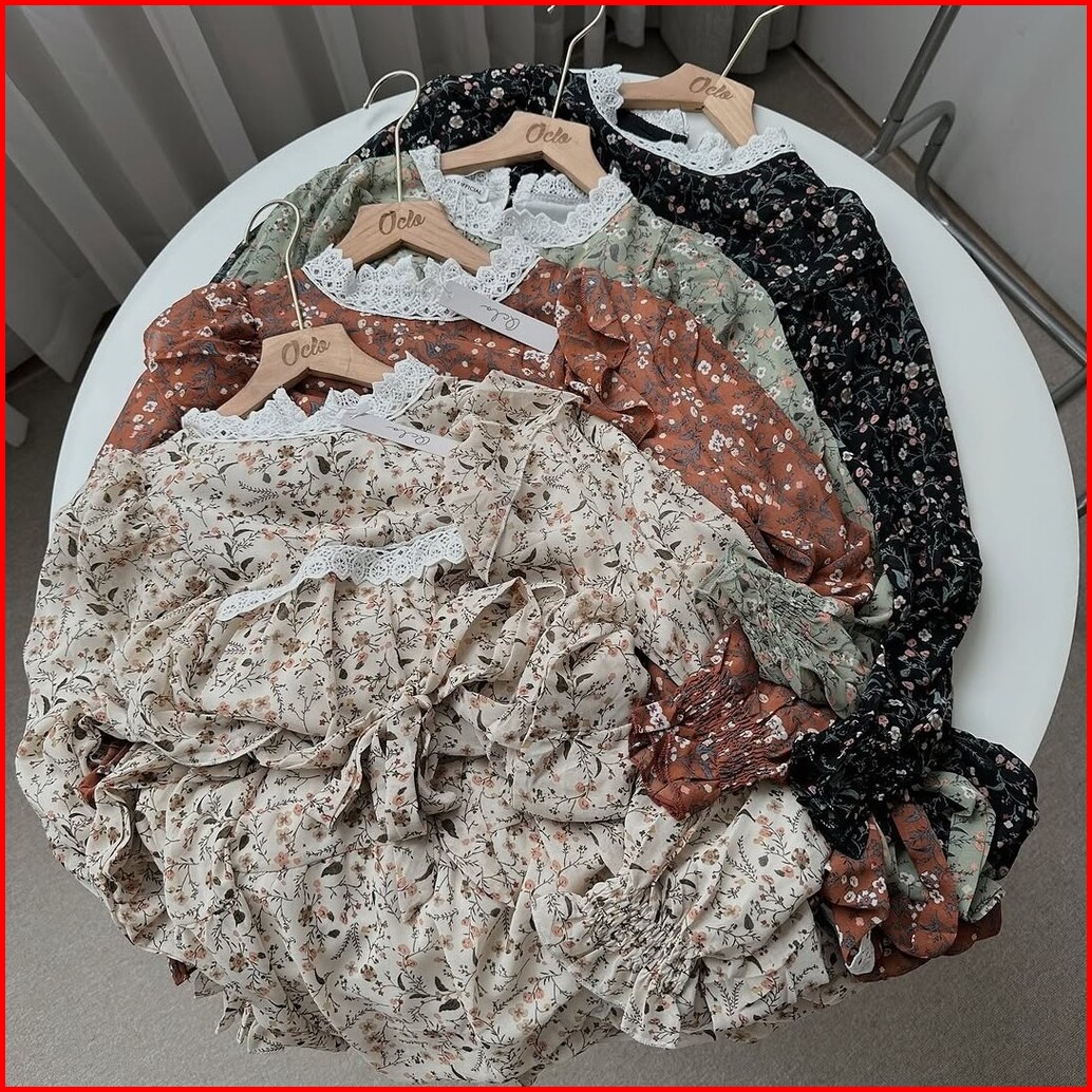 Oclo Eyurra Tunic Atasan Wanita Bunga Ceruty Lace Renda Ruffle Vintage Ocl00331