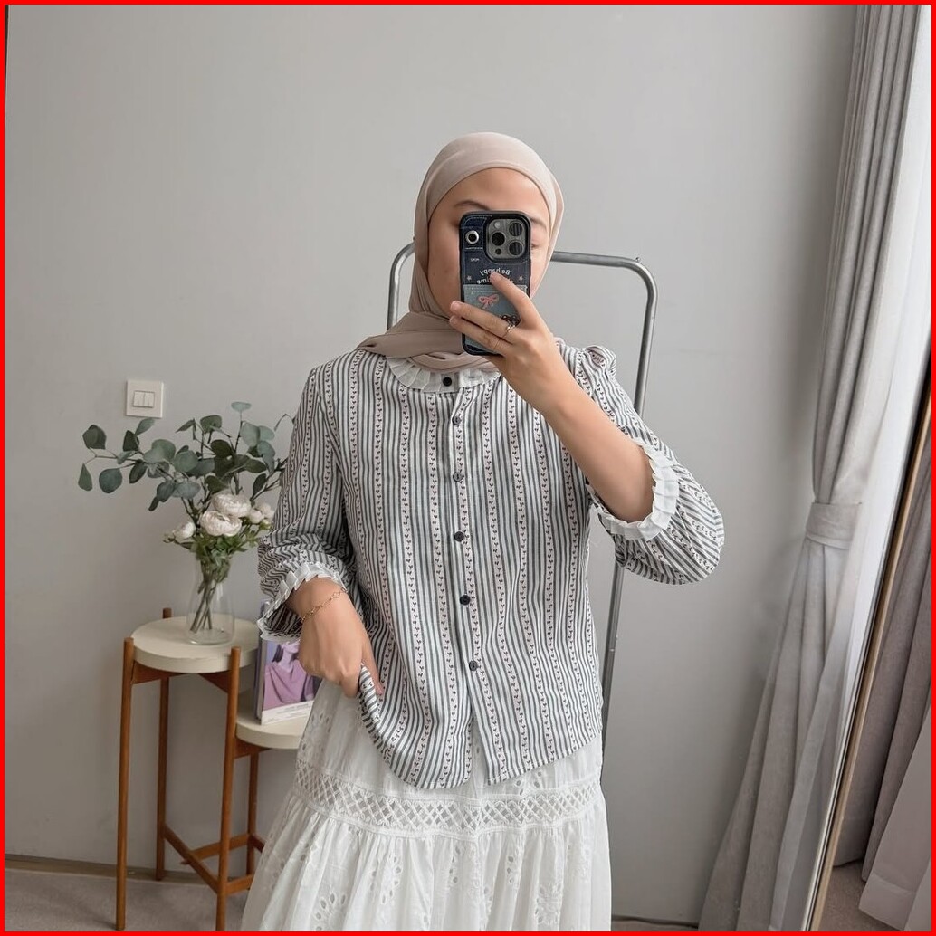 Oclo Zacita Blouse Motif Garis Kotak Cotton Linen Lace Premium Atasan Wanita Lengan Panjang Ootd Terbaru Ocl01392